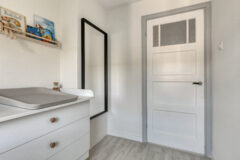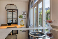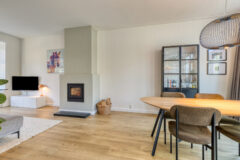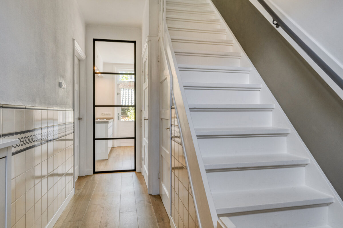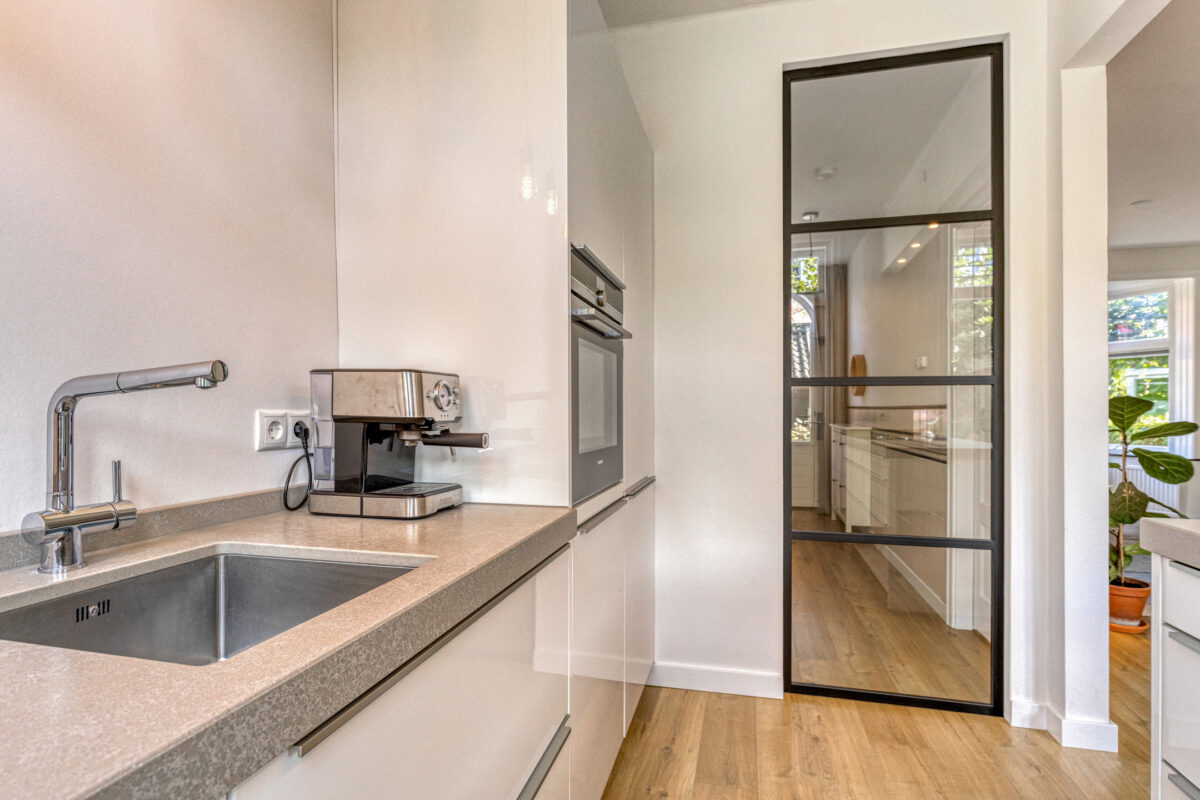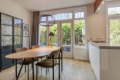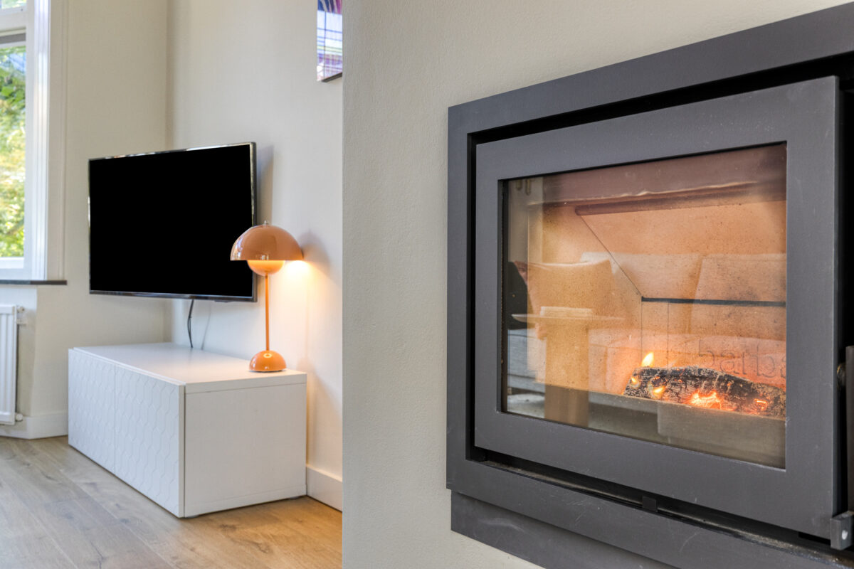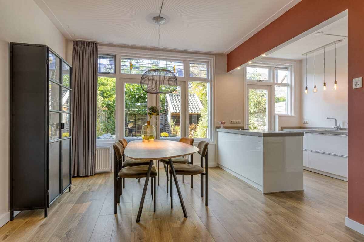 Je komt binnen in de hal met toilet, trapopgang en handige trapkast. Het unieke stalen raamkozijn geeft de hal een moderne twist. Daarnaast zorgt het voor veel lichtinval in de hal en keuken. De woonkamer is ruim en licht, met een erker aan de voorzijde en openslaande deuren naar de tuin. Dankzij de grote raampartijen stroomt het daglicht van beide kanten naar binnen. De Barbas houtkachel (2023) en infrarood vloerverwarming (2018) zorgen in de winter voor extra sfeer en comfort. Achterin ligt de moderne keuken met kookeiland en inbouwapparatuur – dé plek voor lange ontbijtsessies of gezellig koken met vrienden. Vanuit de keuken en het eetgedeelte loop je zo de tuin in.