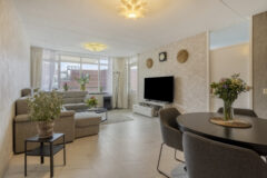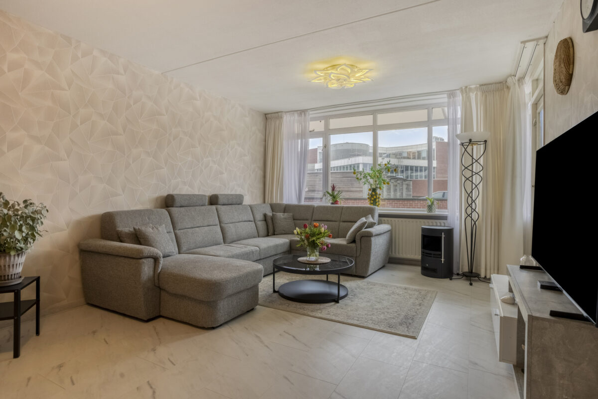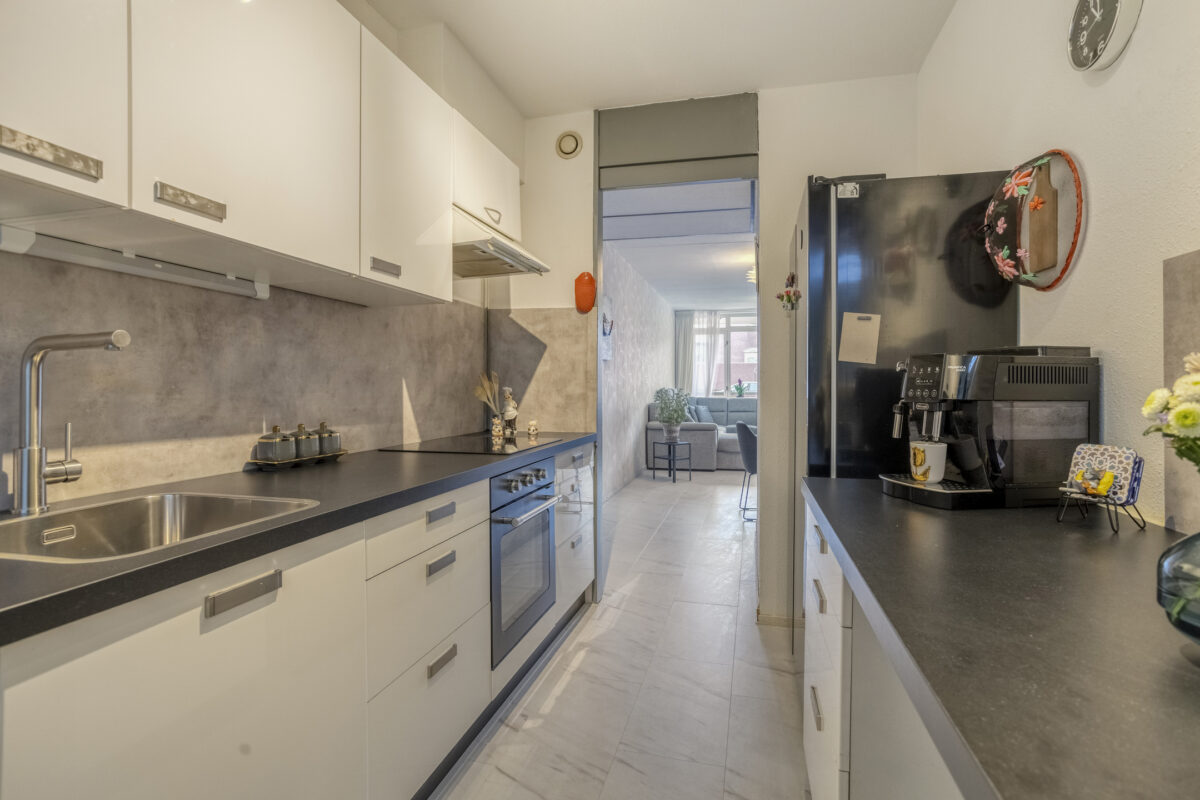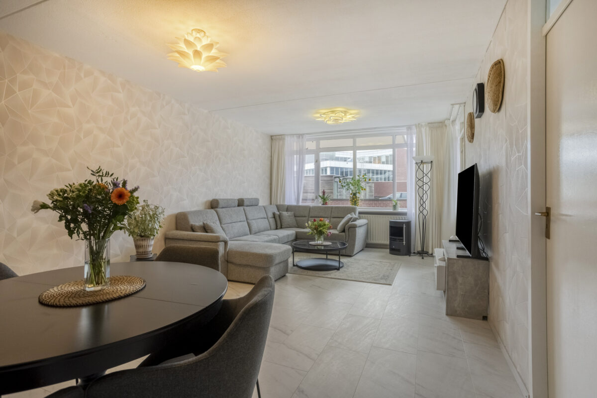 Het appartement is gelegen aan de achterzijde van het complex. Zowel via het trappenhuis als via de lift is er toegang tot de eerste verdieping. Een overdekte galerij/binnenplaats met bloembakken en diverse planten geeft toegang tot het appartement. Bij binnenkomst in de woonkamer valt meteen het ruime formaat op. Er is voldoende ruimte voor een grote hoekbank en een mooie eettafel. Vanuit de woonkamer is er toegang tot de loggia. De loggia heeft een ideale zonsituering op het westen. Dat betekent dus genieten van de middag- en avondzon. De moderne en recent vernieuwde keuken (2024) is aan de voorzijde gelegen en beschikt over de benodigde inbouwapparatuur. De ideale plek om heerlijke maaltijden te bereiden. De moderne badkamer is keurig betegeld en beschikt over een ruime inloopdouche, wastafelmeubel en aansluiting voor de wasmachine en droger. Verder zijn er nog twee ruime slaapkamers en een separaat toilet aanwezig.