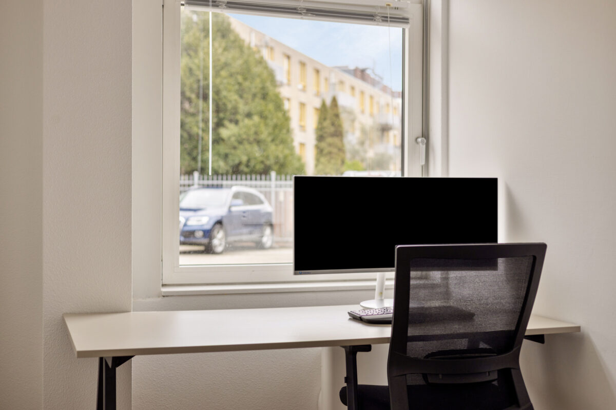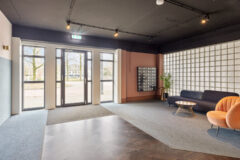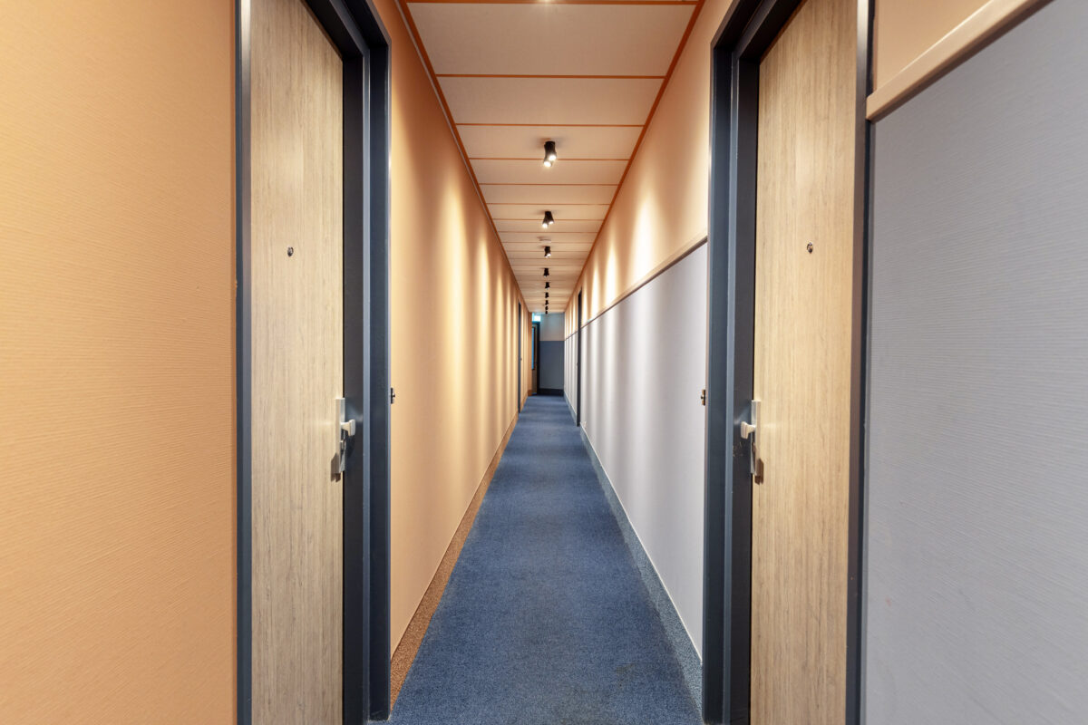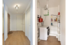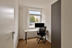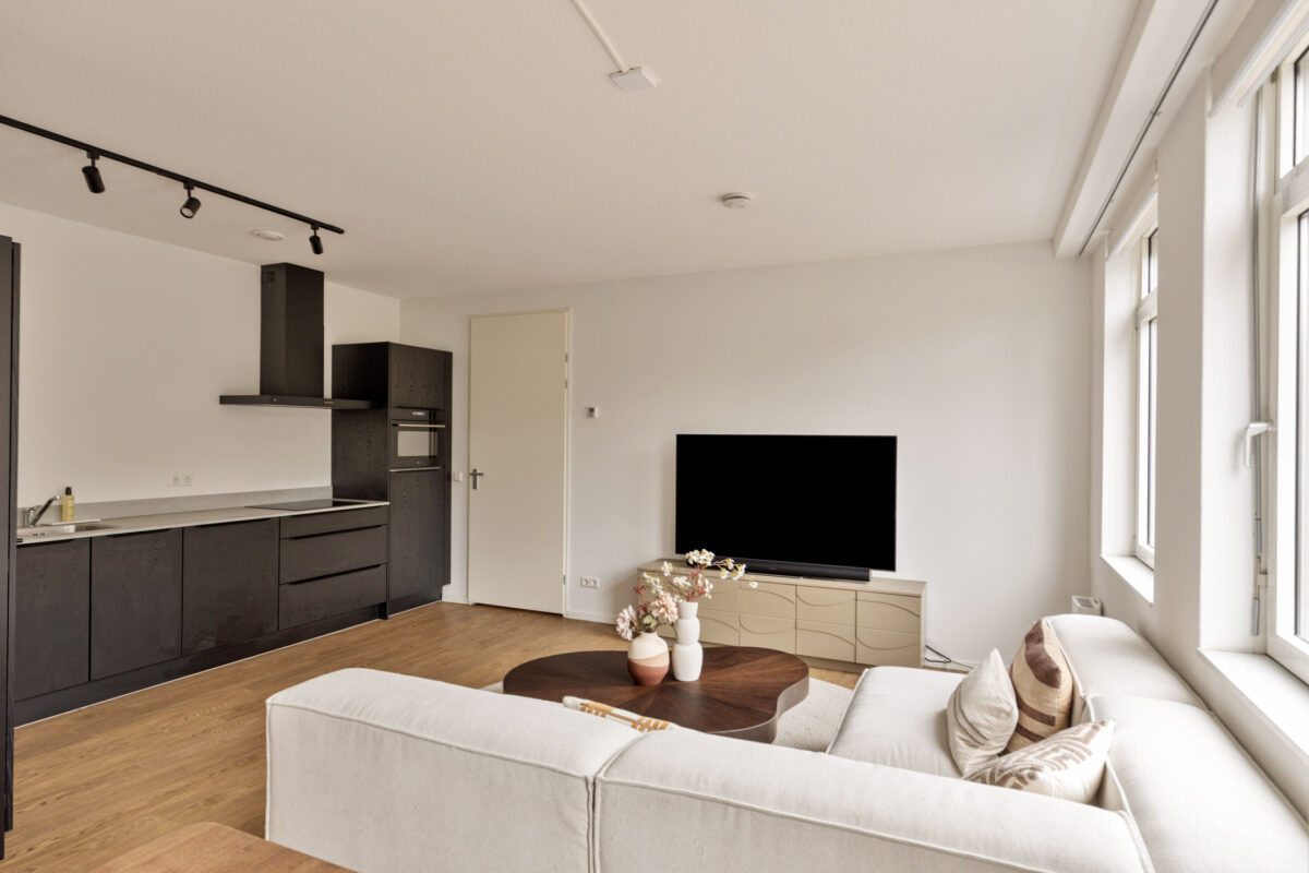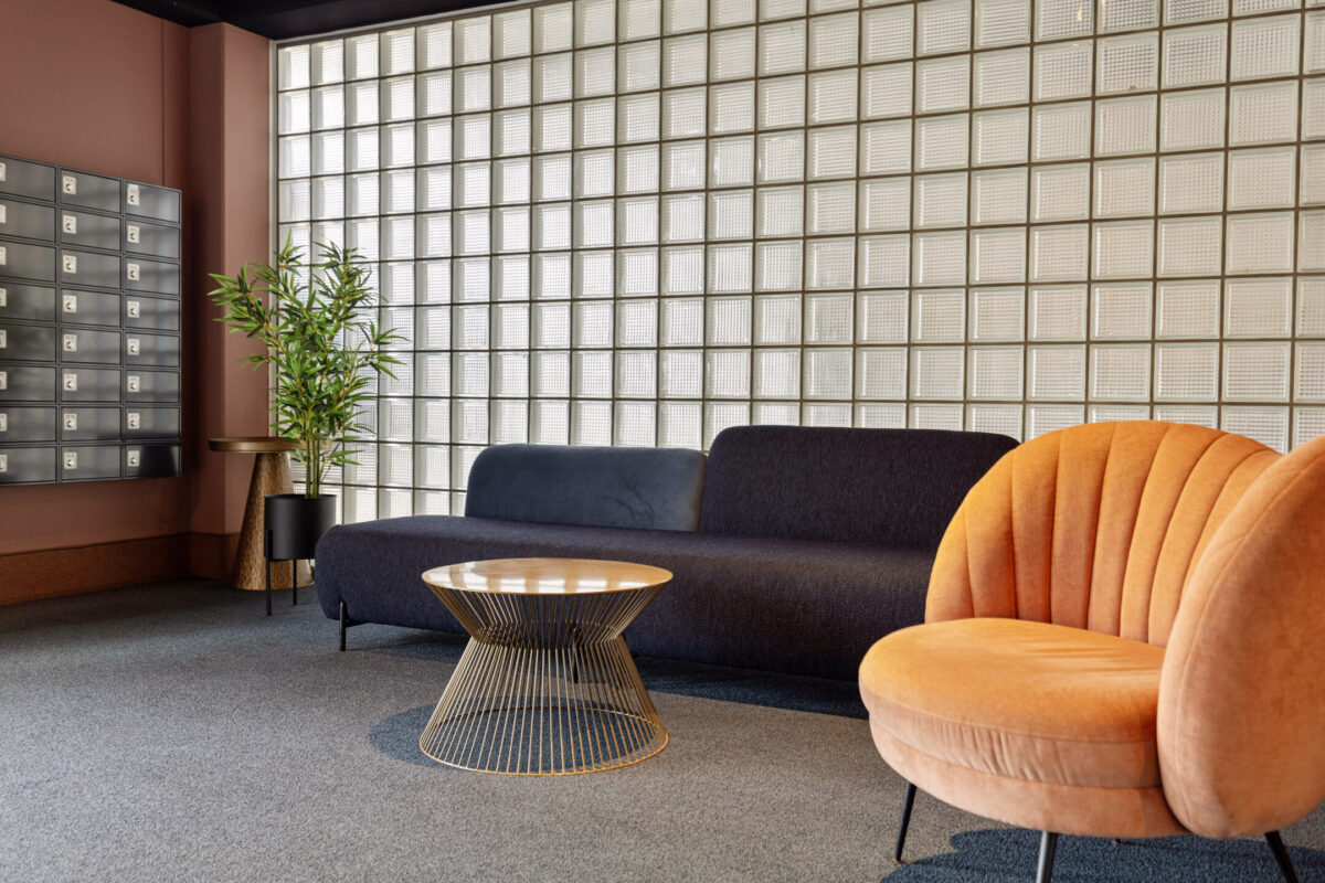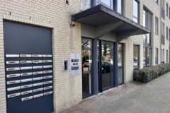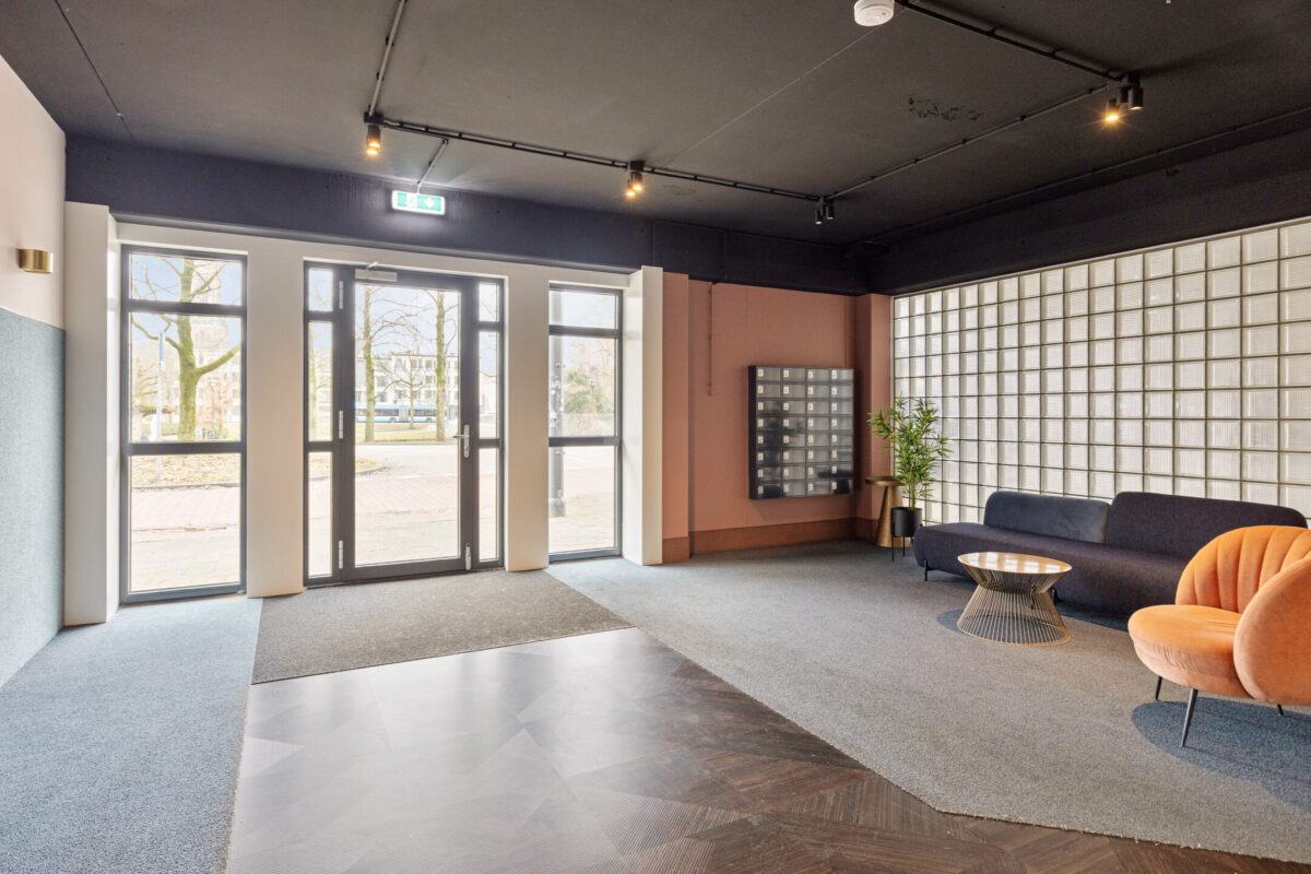 De entree van het complex is modern en verzorgd, met een ruime ontvangsthal, brievenbussen, lift en trappenhuis. Het appartement zelf is praktisch ingedeeld. De royale hal geeft toegang tot alle vertrekken. De woonkamer is een fijne, lichte leefruimte met grote raampartijen en een open keuken die strak tegen de wand is geplaatst. Er is volop ruimte voor zowel een comfortabele zithoek als een eettafel.