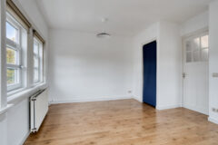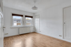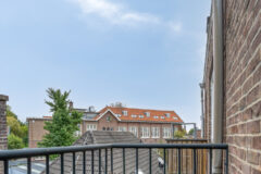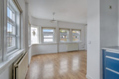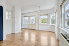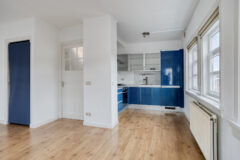 De woonkamer ligt aan de voorzijde en is bijzonder sfeervol dankzij de erker met grote raampartijen. Hierdoor valt er de hele dag door veel daglicht binnen en heb je vrij uitzicht over de straat en de karakteristieke bebouwing in de buurt. De ruimte voelt open en ruimtelijk aan en biedt voldoende plaats voor een comfortabele zithoek en eettafel.