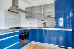 De open keuken sluit mooi aan bij de woonkamer en is praktisch ingericht met diverse inbouwapparaten, waaronder een gaskookplaat, afzuigkap, oven en koelkast. Hier kun je met gemak een maaltijd bereiden terwijl je in contact blijft met de woonkamer.
