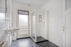 Aan de achterzijde bevindt zich de ruime slaapkamer, die rust en privacy biedt. Dankzij de vaste kasten is er volop bergruimte aanwezig. Aansluitend ligt de badkamer, die is uitgevoerd met lichte wandtegels, een douchecabine, wastafel, toilet en aansluiting voor de wasmachine. Vanuit de badkamer heb je toegang tot het balkon – een fijne plek voor een kop koffie in de ochtendzon.