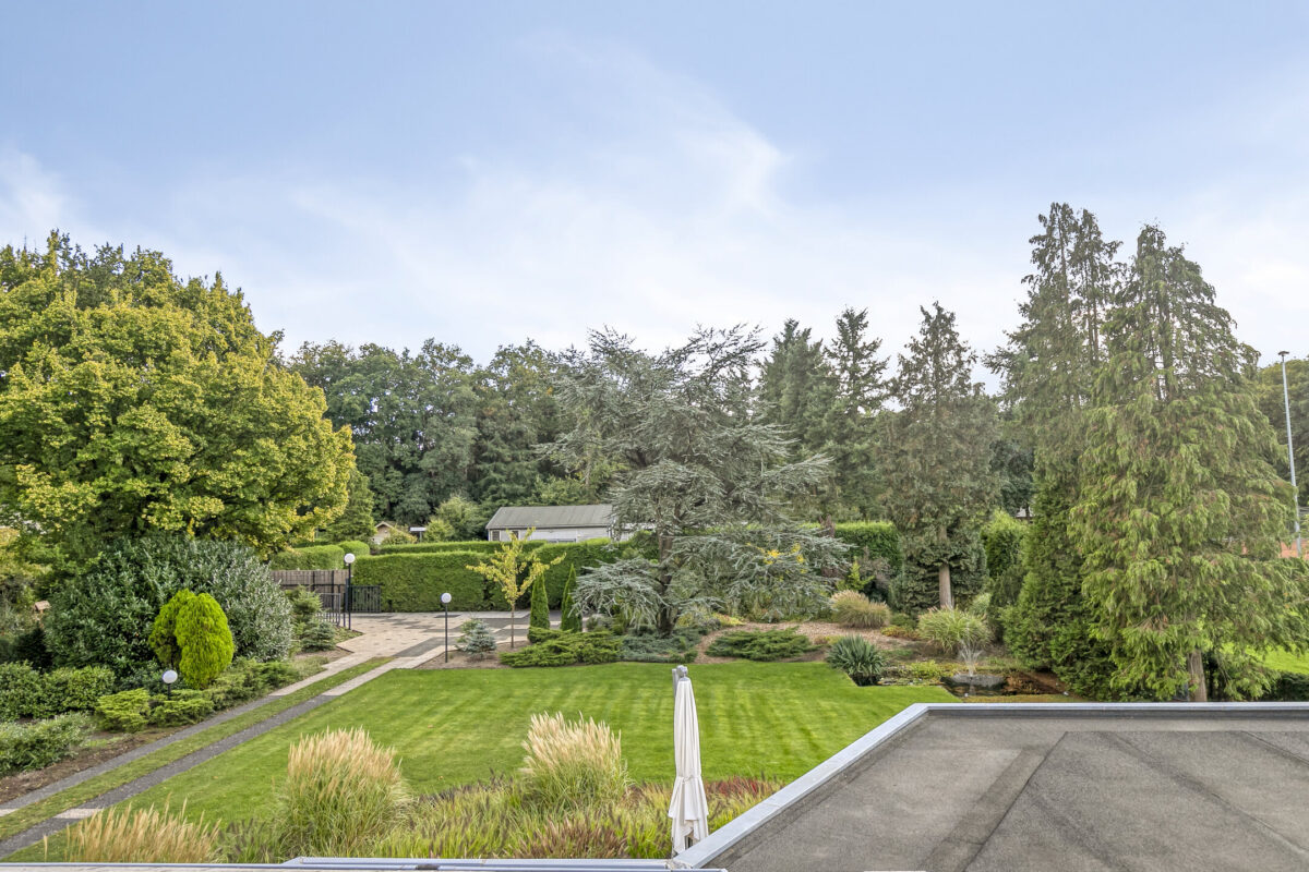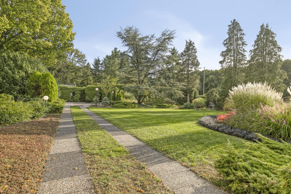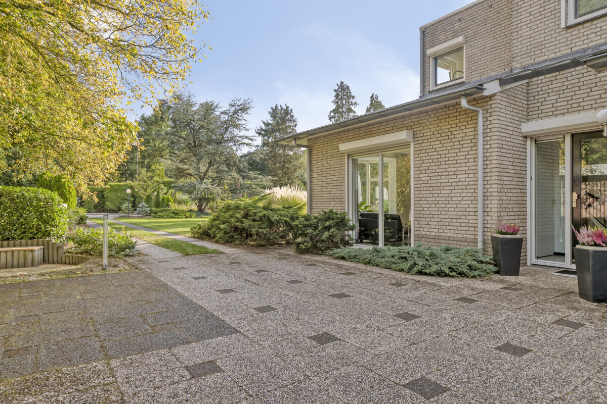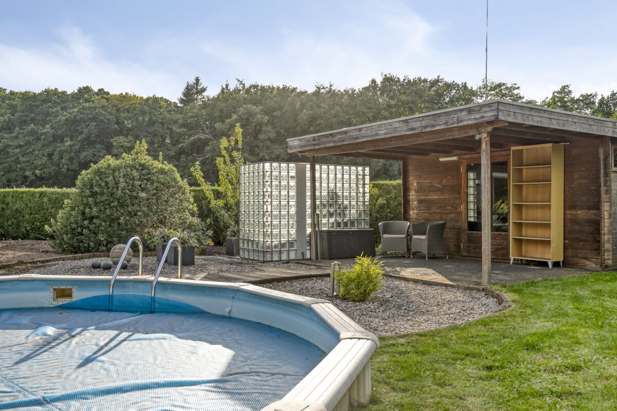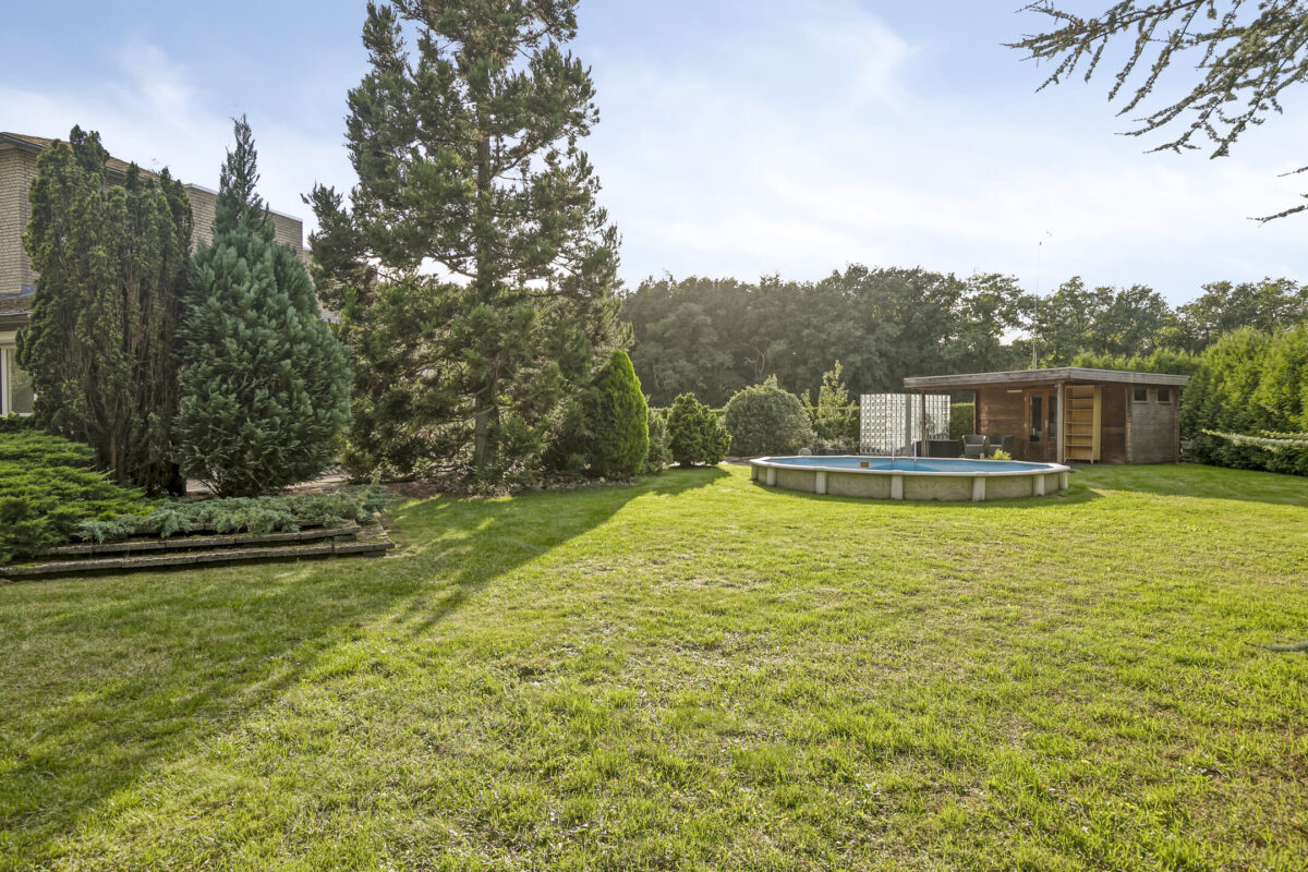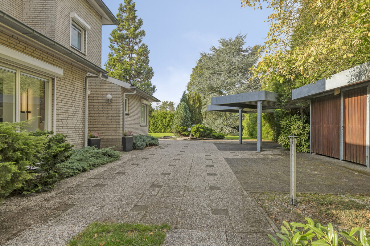 De fraai aangelegde tuin rondom de villa heeft de allure van een privépark. Volwassen bomen, strakke gazons, kleurrijke borders en meerdere terrassen zorgen voor een groene en rustige omgeving waarin u in alle privacy kunt genieten. Het zwembad met buitendouche maakt het buitenleven compleet en biedt de perfecte plek voor ontspanning en vermaak. Daarnaast zijn er een stijlvolle stalen carport voor twee auto’s en een houten berging aanwezig. De ligging en de begroeiing garanderen optimale privacy en rust.