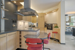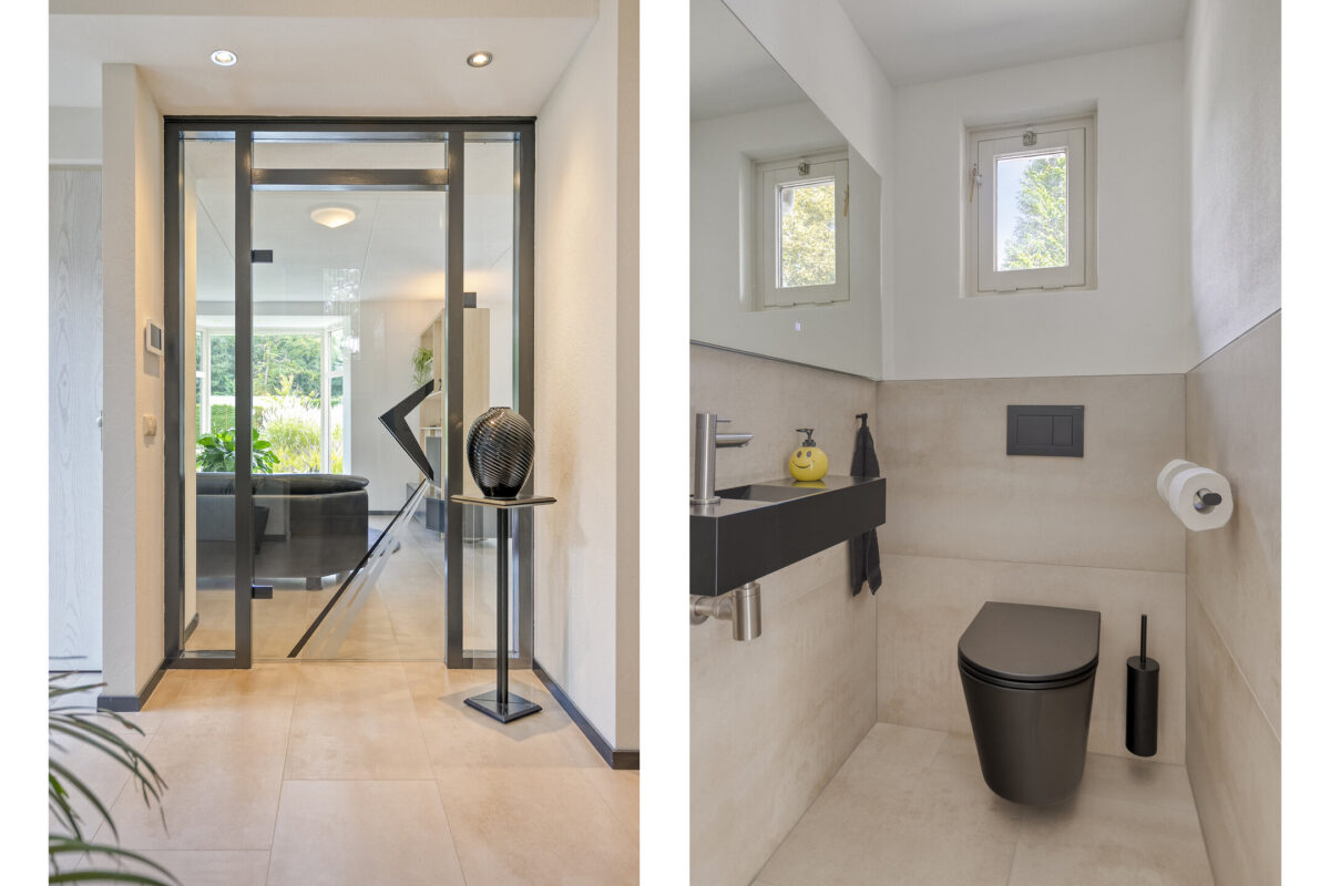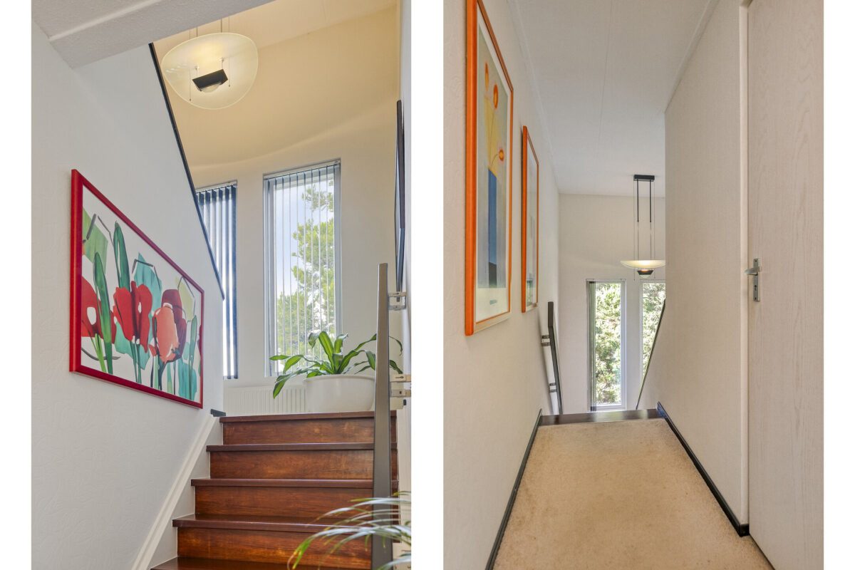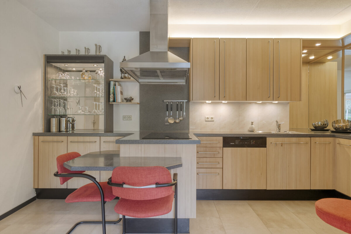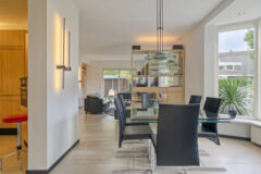 Bij binnenkomst in de ruime hal met garderobe en toilet ervaart u direct de open en lichte sfeer van de woning. De royale woonkamer vormt het hart van het huis: een comfortabele leefruimte met meerdere zithoeken waar de grote raampartijen zorgen voor een prachtige lichtinval en een weids uitzicht op de tuin. De woonkamer staat in directe verbinding met de eetkamer, waardoor een natuurlijke overgang ontstaat tussen ontspannen en tafelen. Aangrenzend bevindt zich de halfopen keuken, uitgevoerd in lichte tinten en voorzien van diverse inbouwapparatuur.