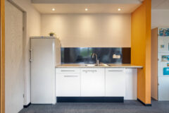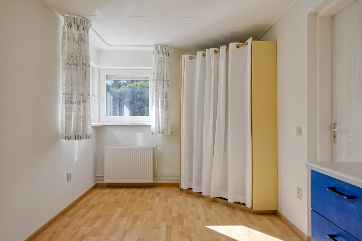 Vanuit de keuken is er toegang tot de bijkeuken waar zich de opstelling voor de wasapparatuur en extra bergruimte bevindt. Deze praktische ruimte loopt door naar de hobby- of werkkamer. Deze kamer kan desgewenst eenvoudig worden ingericht als slaapkamer op de begane grond, waarbij de mogelijkheid bestaat om hier tevens een badkamer te realiseren. Dit maakt de woning uitstekend geschikt voor levensloopbestendig wonen.