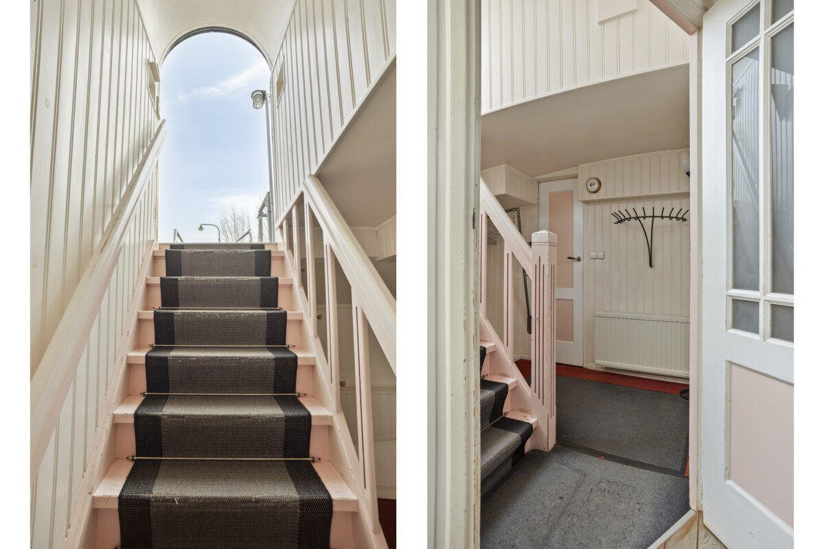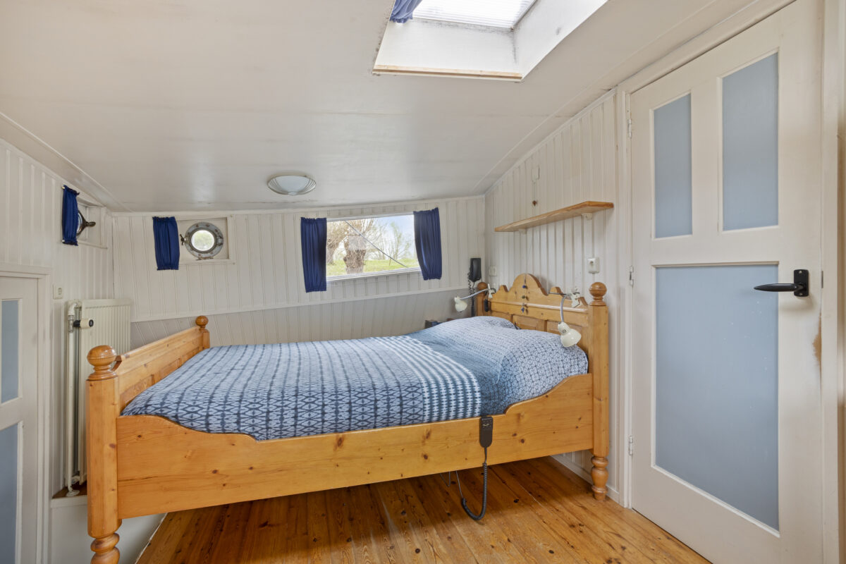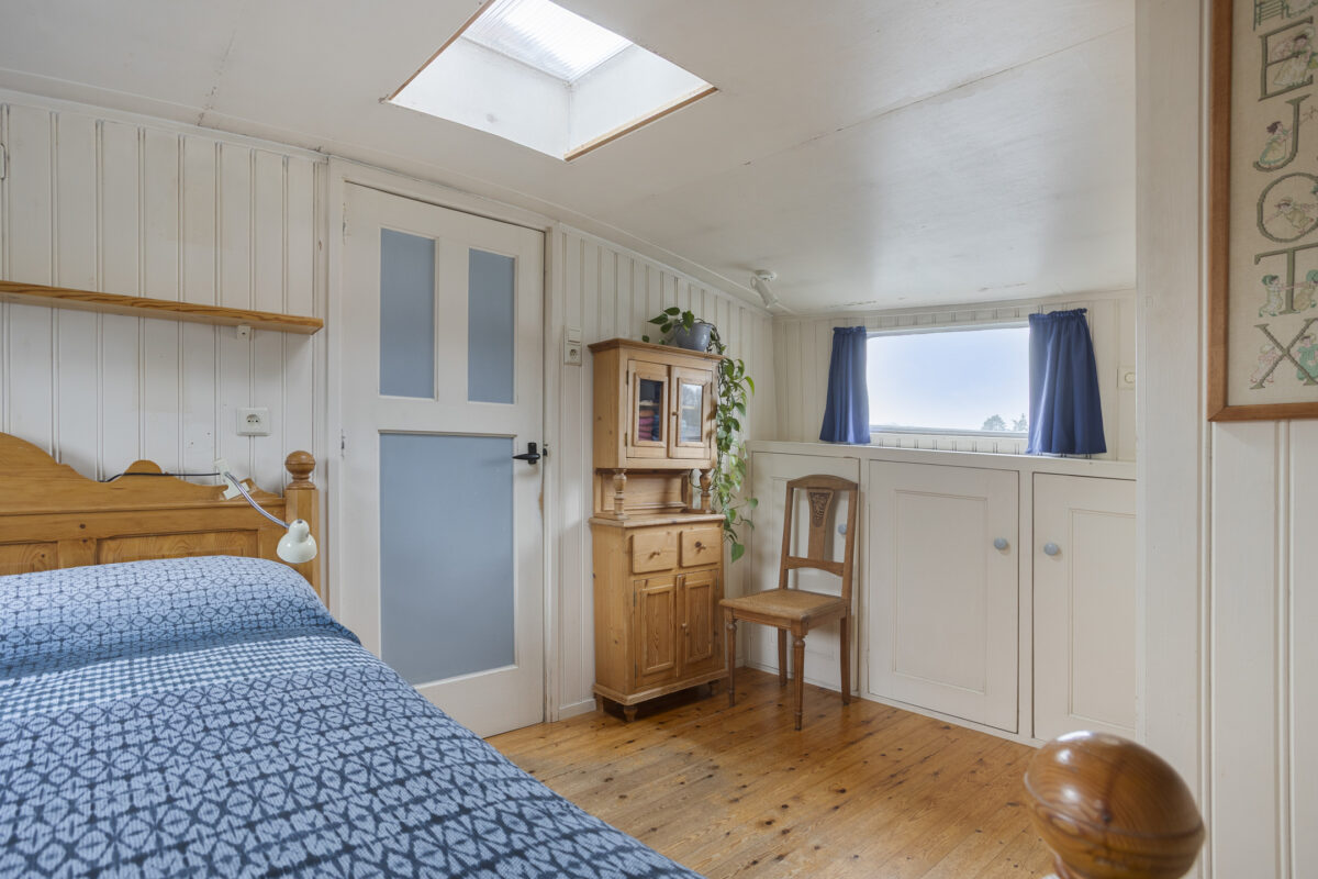 De hoofdslaapkamer is licht en rustig, met zicht naar buiten en de karakteristieke patrijspoorten die blijven herinneren waar je bent.