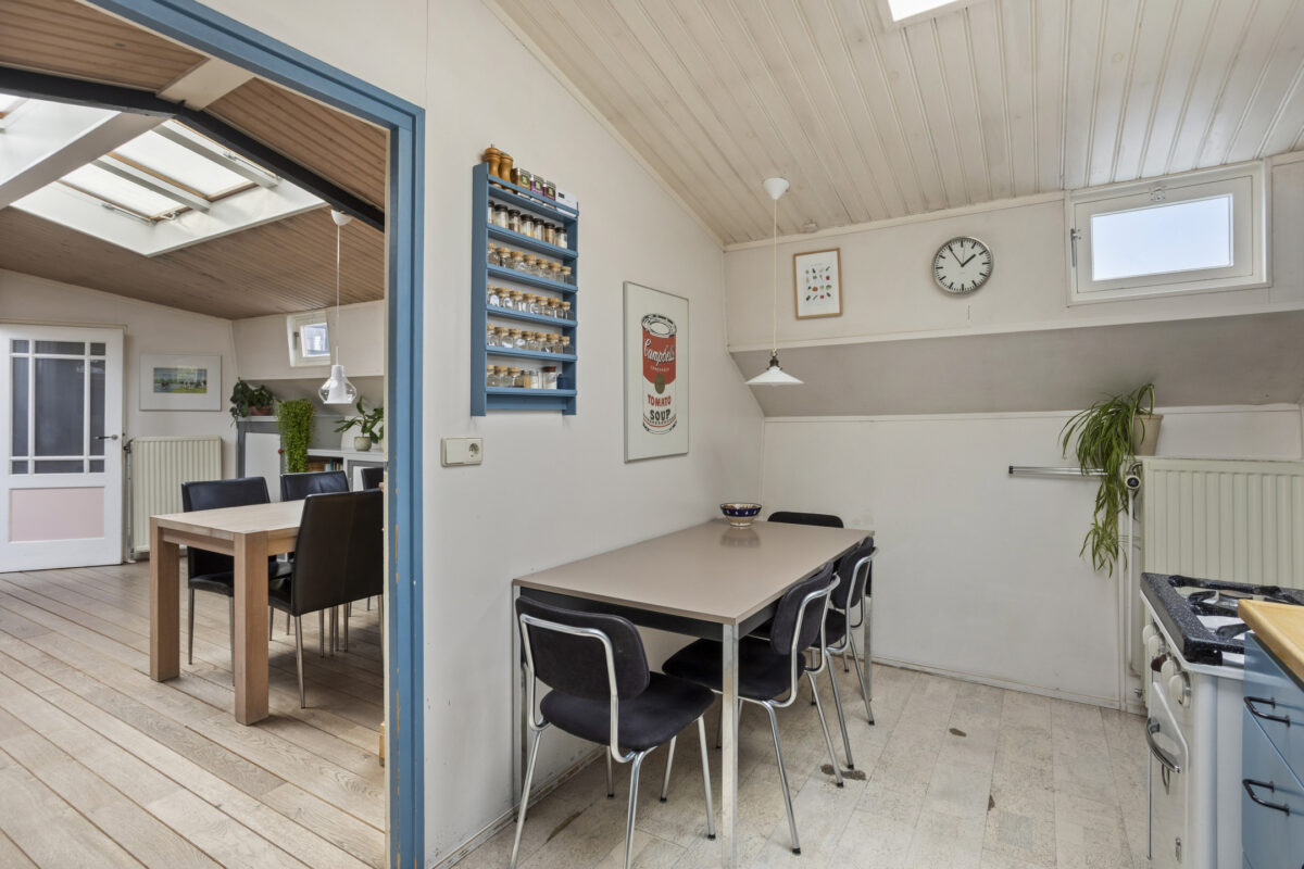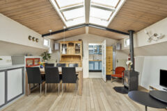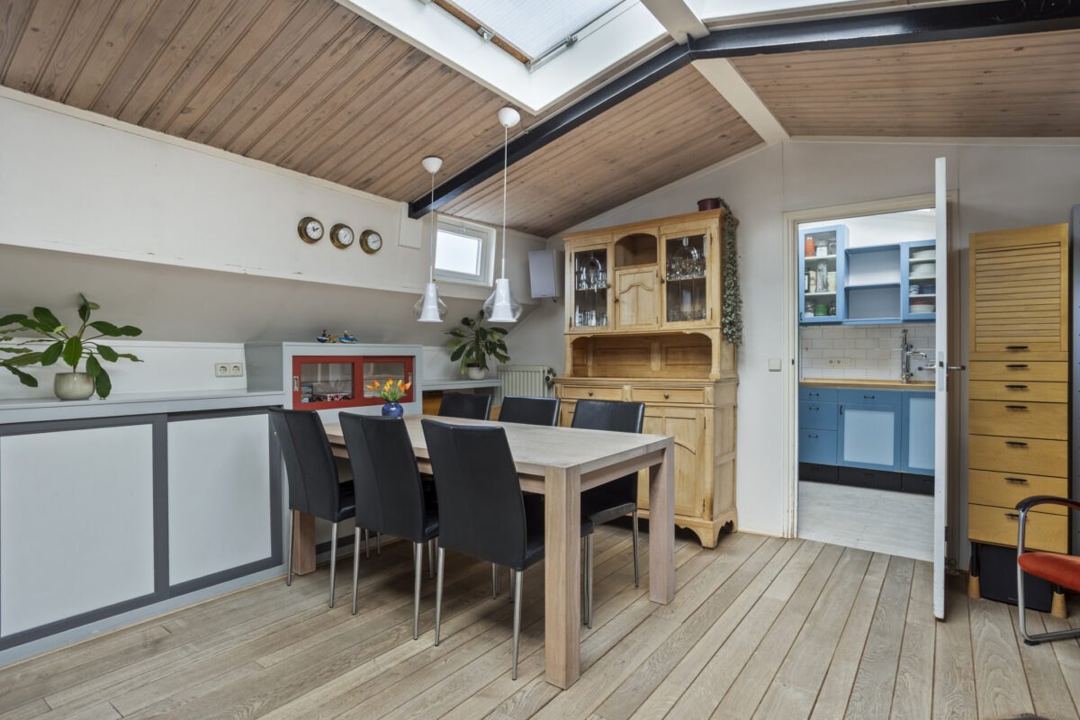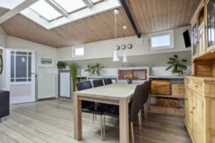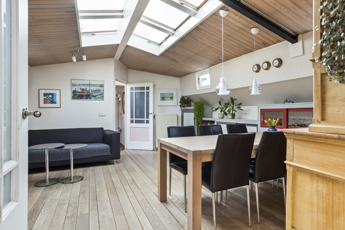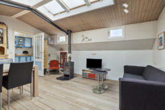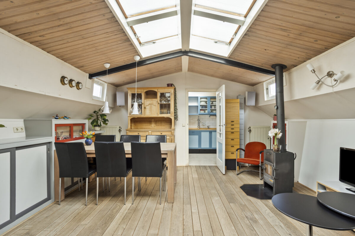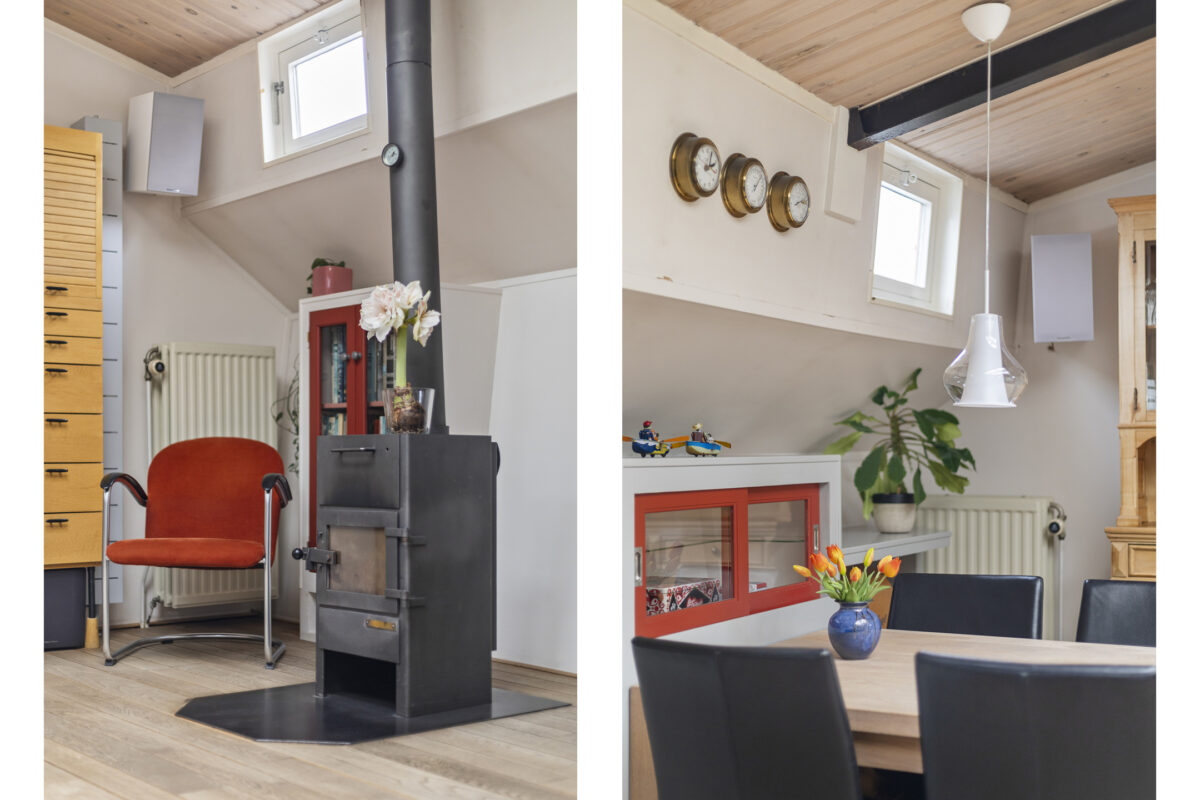 Binnen valt het licht op. Door de kap en de dakramen komt het prettig naar binnen. De ruimte voelt open, maar beschut. De woonkamer en eethoek vormen één geheel. De houtkachel staat er vanzelfsprekend en maakt het af.