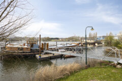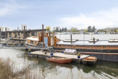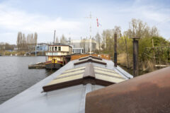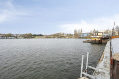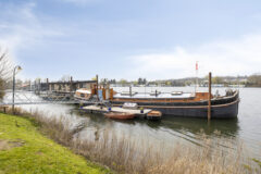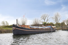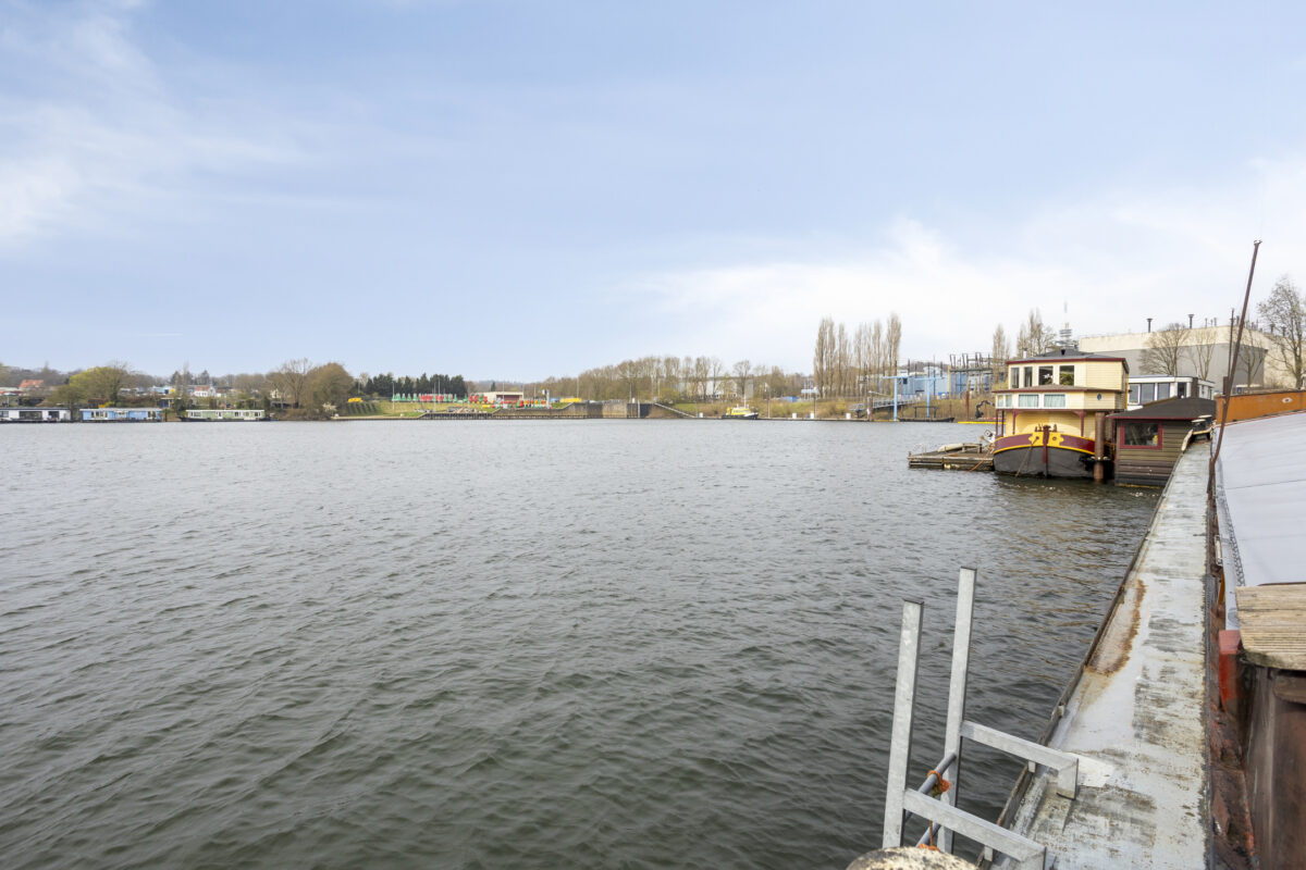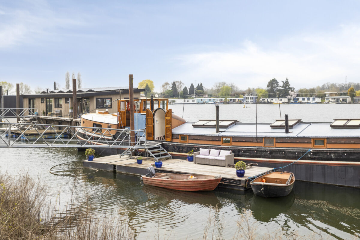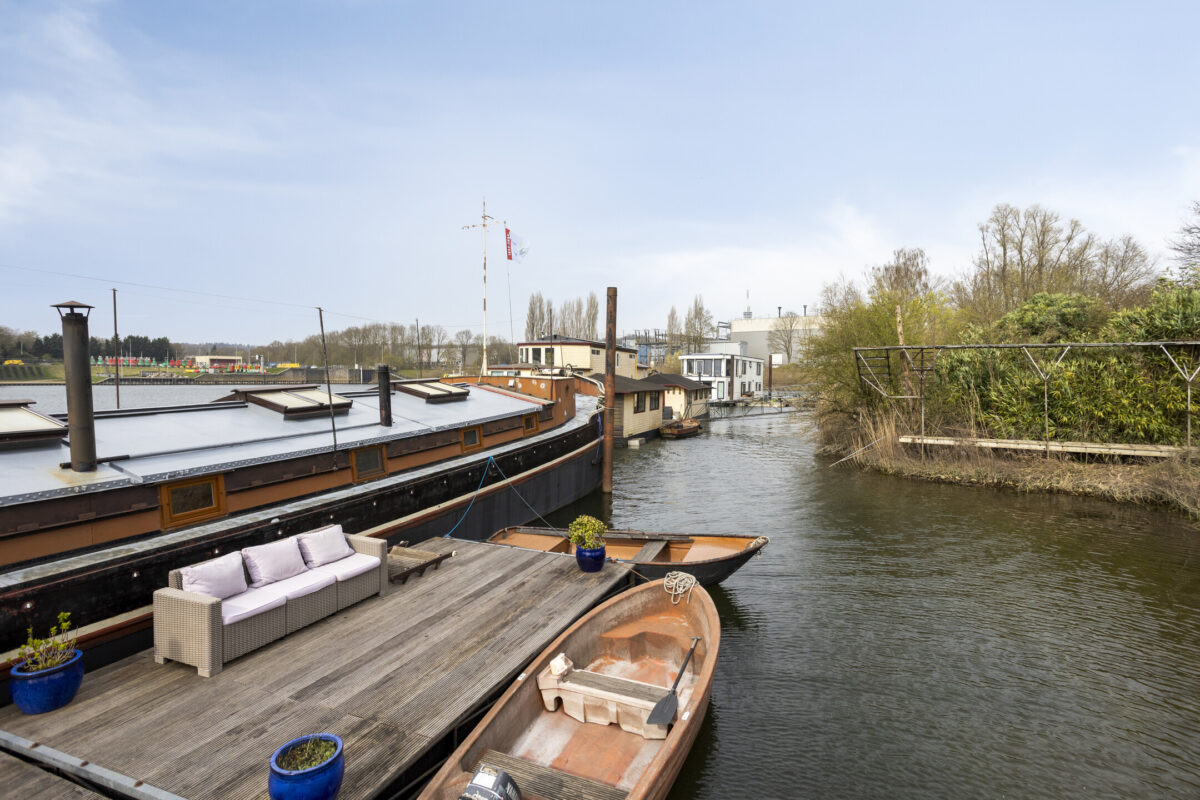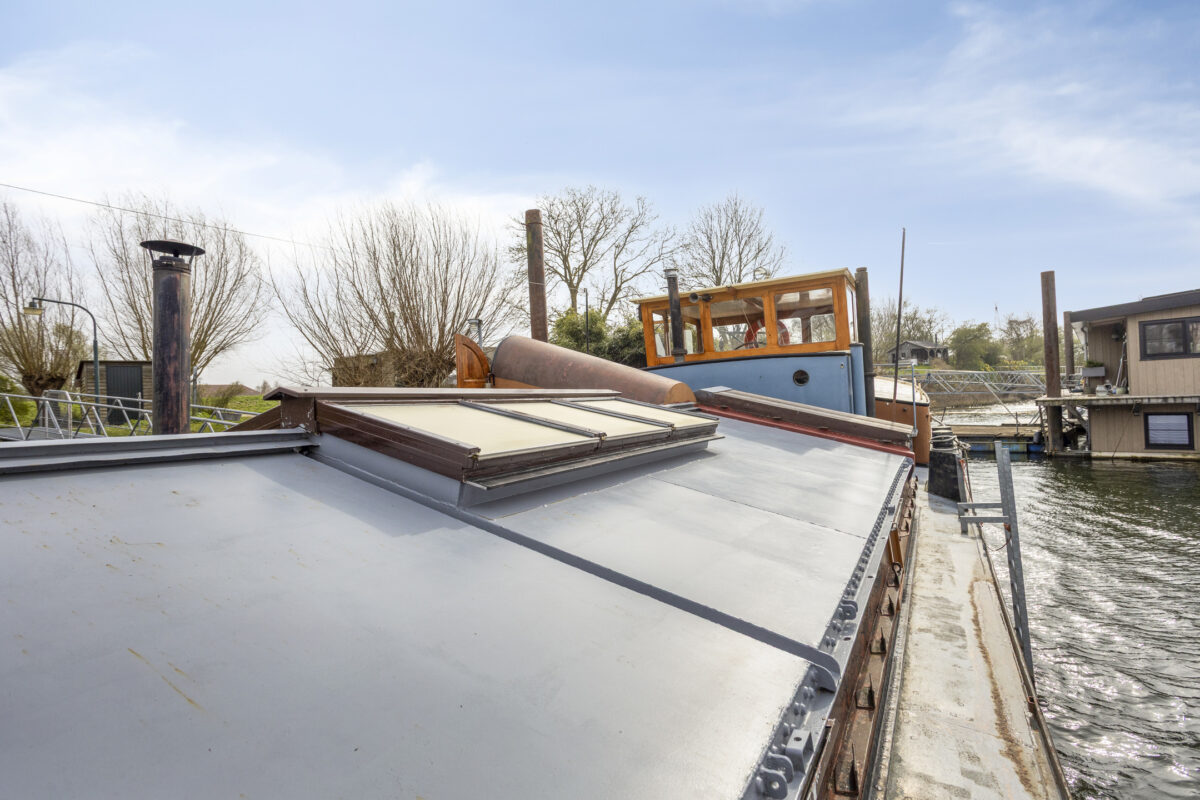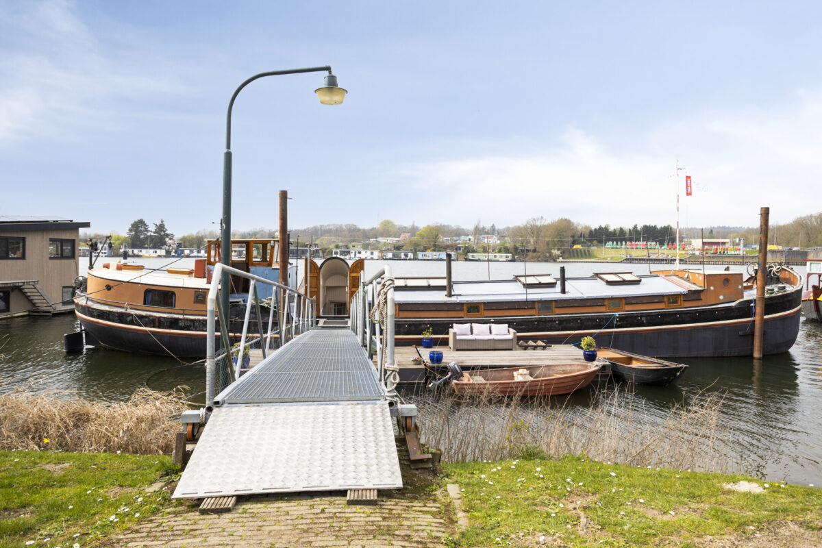 Aan het einde van de Rosandepolder ligt deze stalen woonboot. Vrij gelegen, stil en met uitzicht over het water en de uiterwaarden. Een plek waar je niet zomaar komt, maar waar je bewust voor kiest.