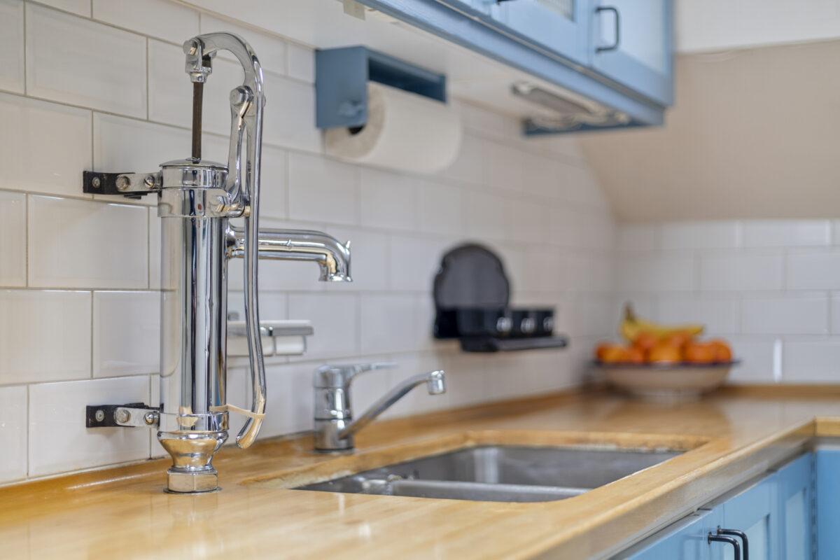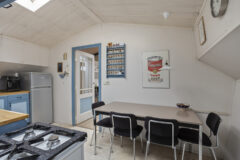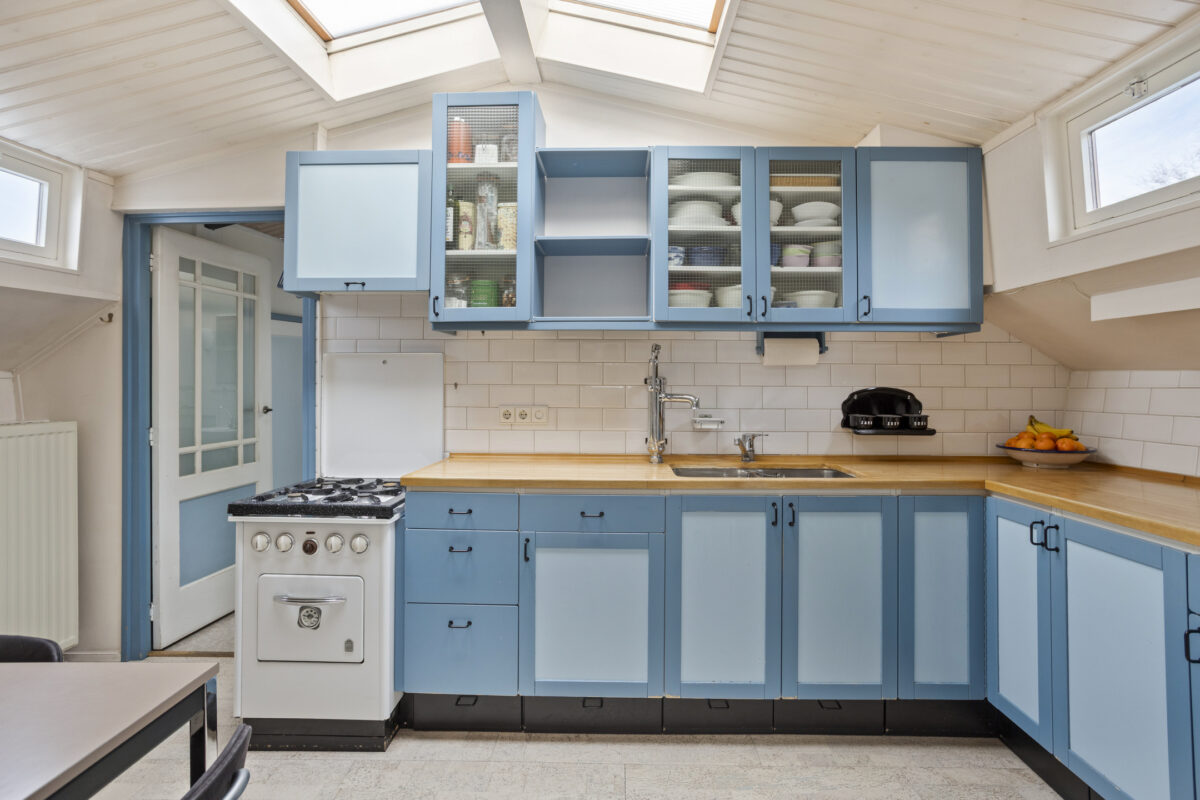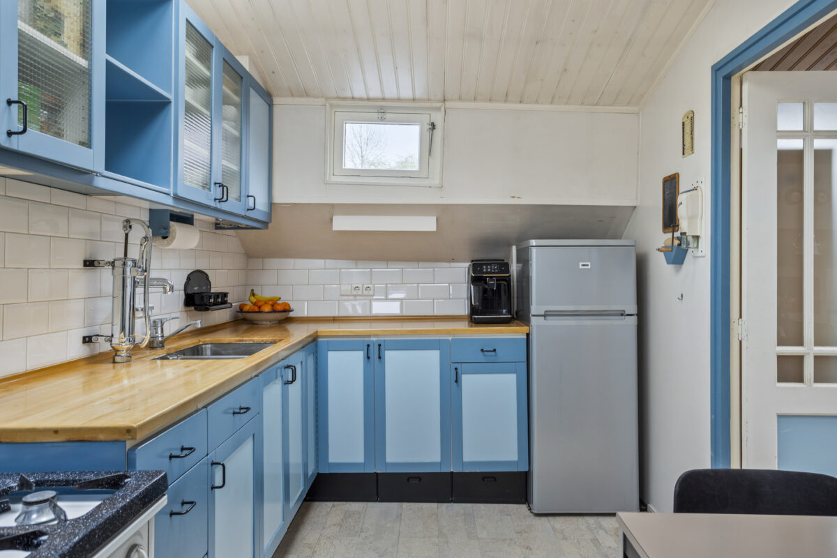 De keuken is eenvoudig goed. Blauwe fronten, een houten werkblad en logisch ingedeeld. Alles wat je nodig hebt, zonder overdaad.