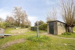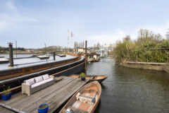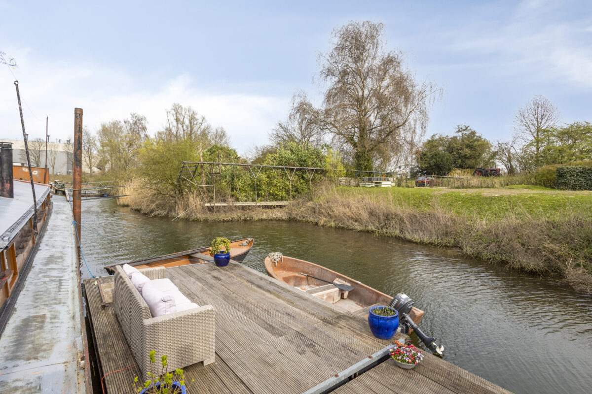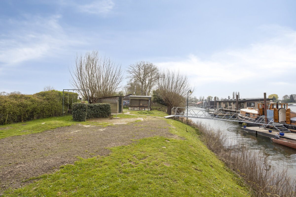 Aan de zijkant van het perceel ligt een extra loopbrug, die bij hoog water wordt gebruikt om de woonboot te bereiken.
