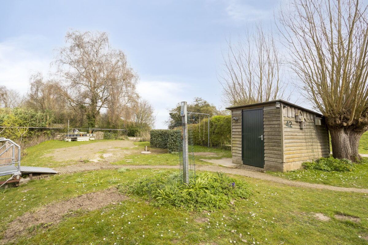 Op de ligplaats staan twee praktische bergingen. Handig voor opslag of hobby, zonder dat het de plek overneemt. Het perceel bestaat uit gazon, een zonneterras en er is ruimte voor auto’s op eigen terrein.
