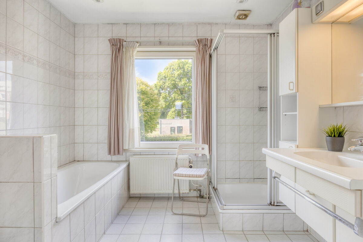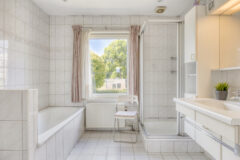 Op de eerste verdieping bevinden zich twee ruime slaapkamers, waarvan de grootste toegang biedt tot een balkon met uitzicht op de tuin. De badkamer is royaal van formaat en voorzien van een ligbad, separate douche, wastafelmeubel en toilet. Daarnaast is er een praktische wasruimte aanwezig.