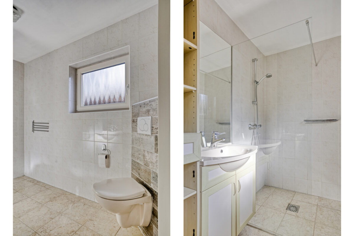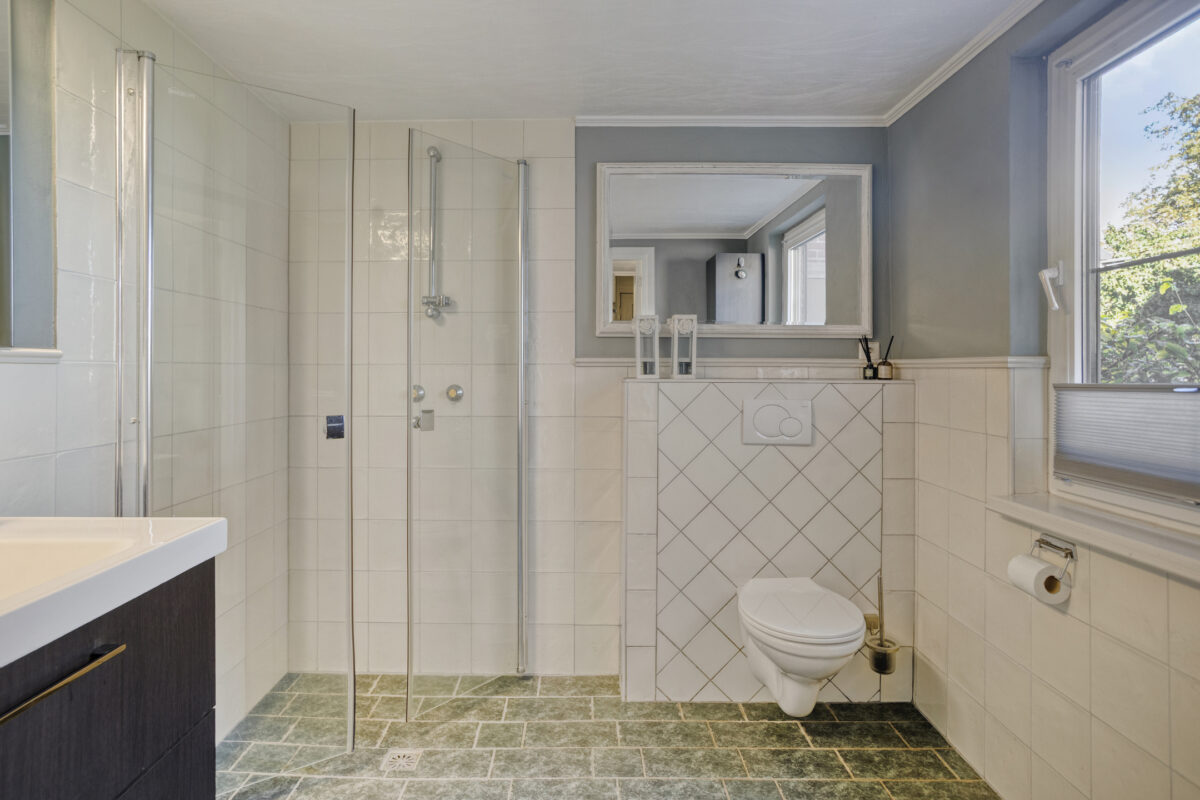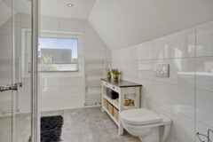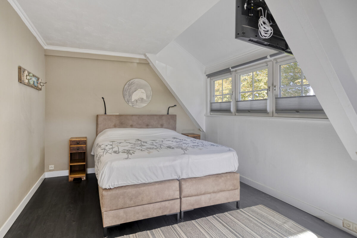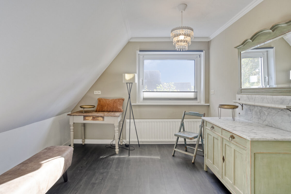 Via de vaste trap kom je op de royale overloop. Hier bevinden zich drie slaapkamers, waarvan de hoofdslaapkamer extra ruim is en één kamer als kleedkamer wordt gebruikt. De moderne badkamer is voorzien van een inloopdouche, wastafelmeubel en toilet.