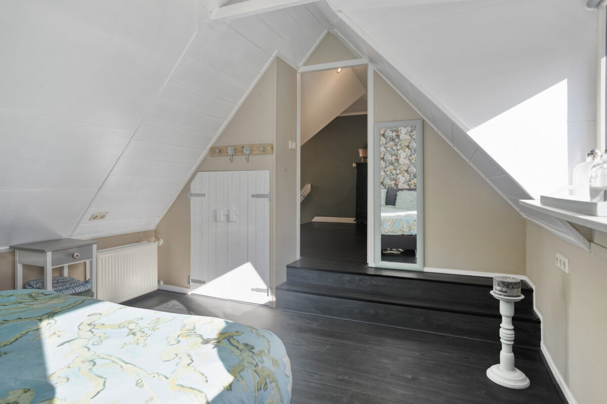 Via een vaste trap bereik je de zolder, die uit twee gedeelten bestaat. Een open gedeelte en een bergruimte.