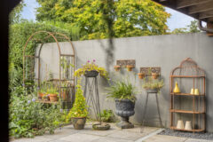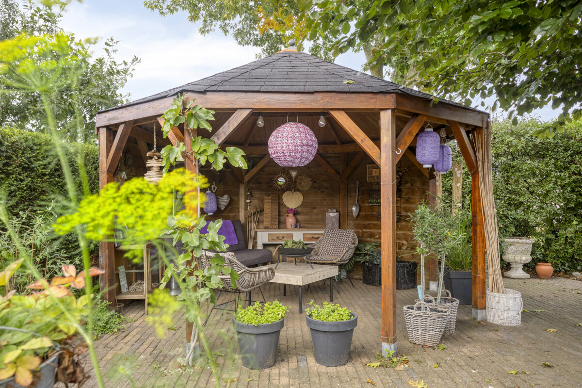 De tuin is werkelijk prachtig aangelegd. De borders met bloemen en struiken, het gazon en het straatwerk vormen samen een harmonieus geheel. Er zijn meerdere zitjes aangelegd, zodat je op elk moment van de dag kunt genieten van de zon en het uitzicht op de tuin. Een sauna en een sfeervol prieel biedt bovendien een heerlijke plek om te ontspannen of te werken in de buitenlucht.