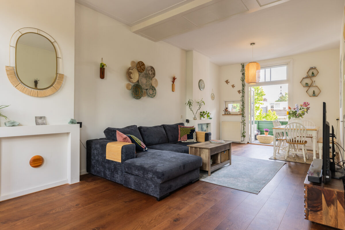 De L-vormige living voelt direct als een uitnodigende leefruimte. Grote raampartijen aan beide zijden zorgen voor veel daglicht en uitzicht op het groen in de straat. De houten vloer, rustige kleuren en sfeervolle details creëren een ontspannen en huiselijke sfeer. Aan de achterzijde bevindt zich het eetgedeelte met openslaande deuren naar het ruime balkon. Dankzij de ligging op het zuiden geniet je hier vrijwel de hele dag van de zon.