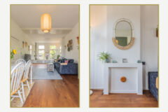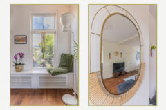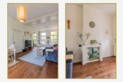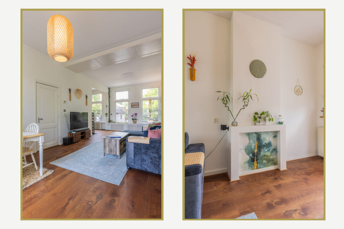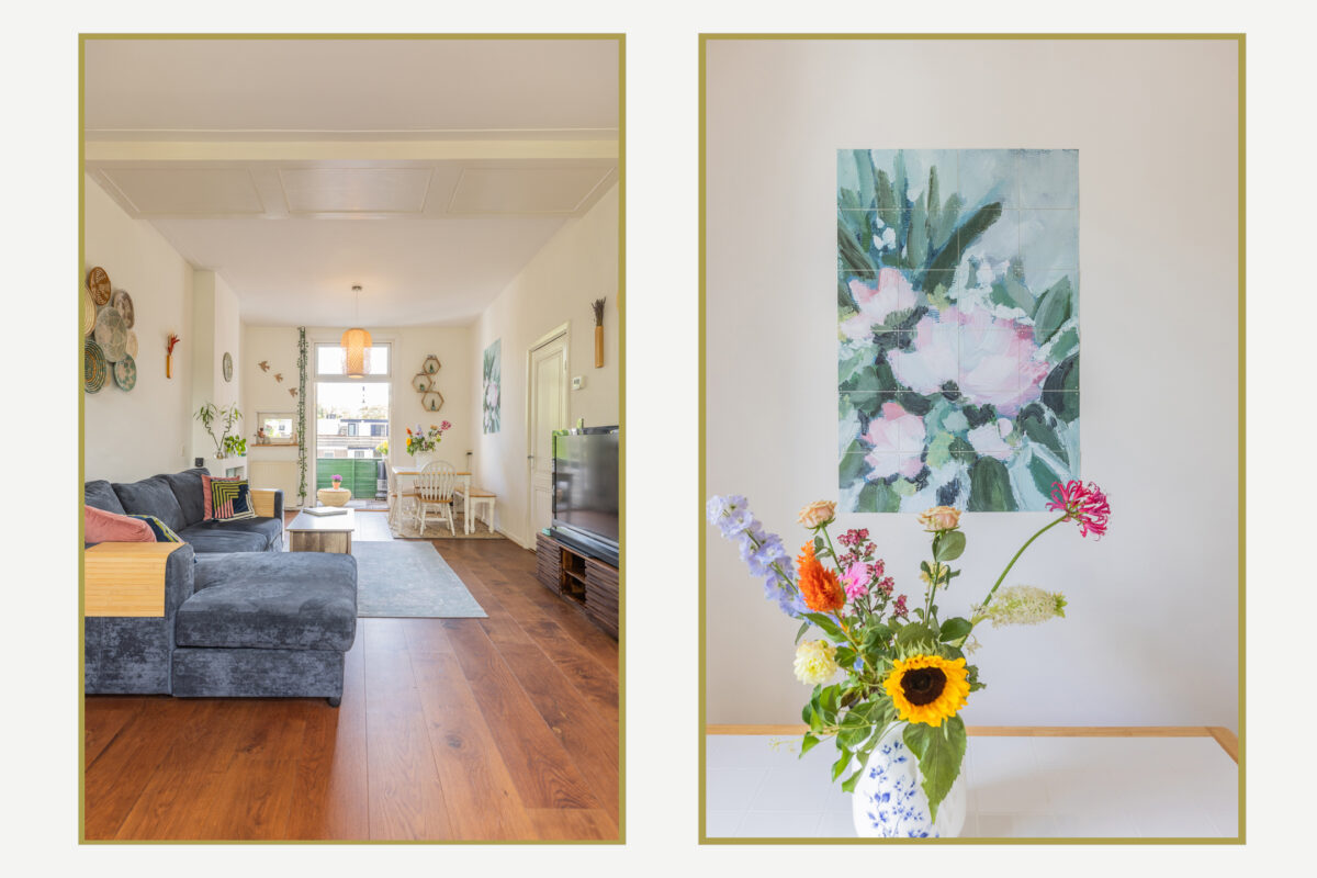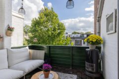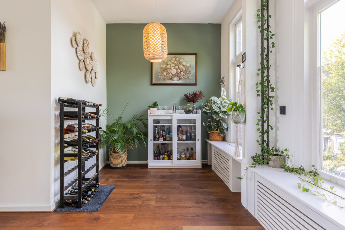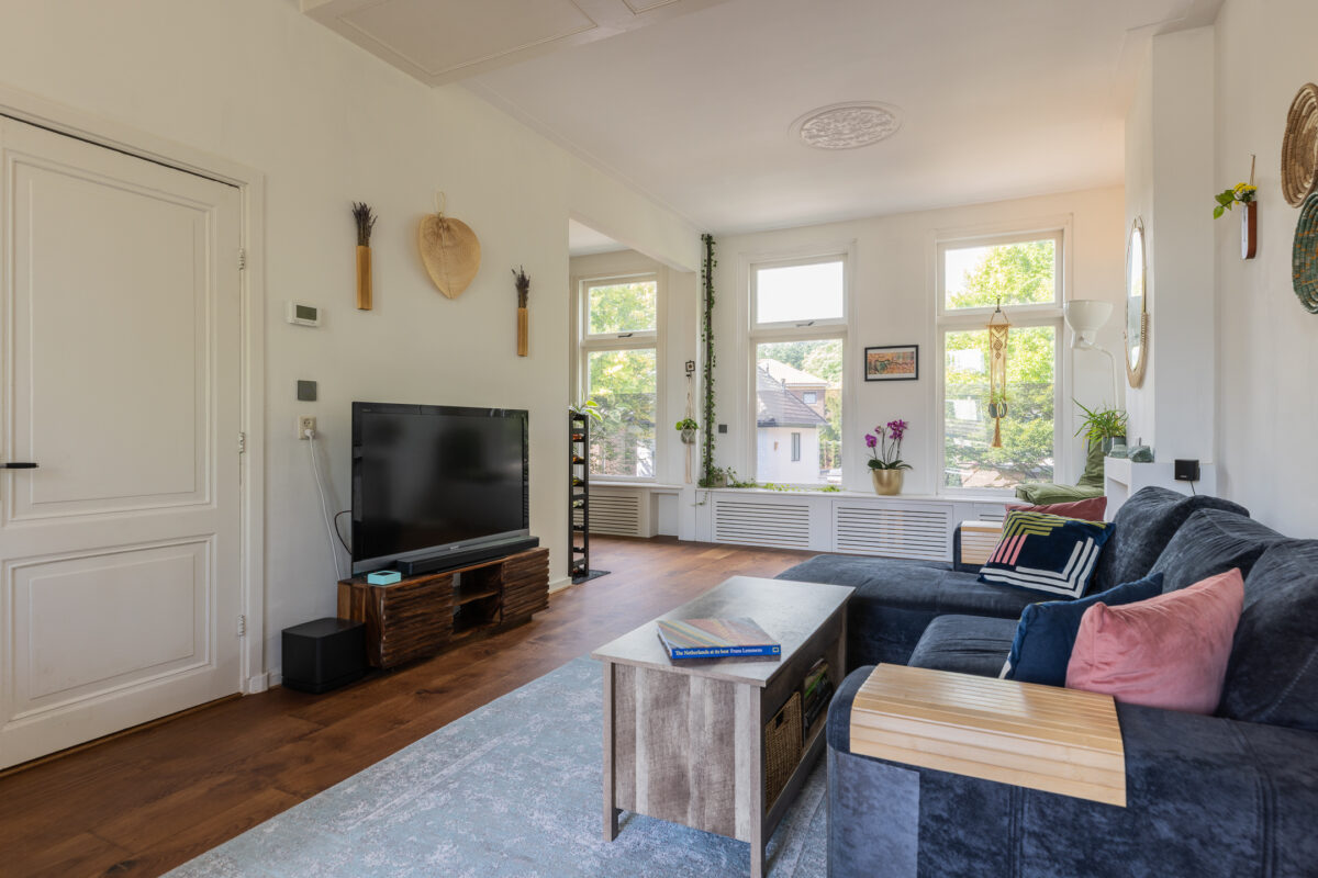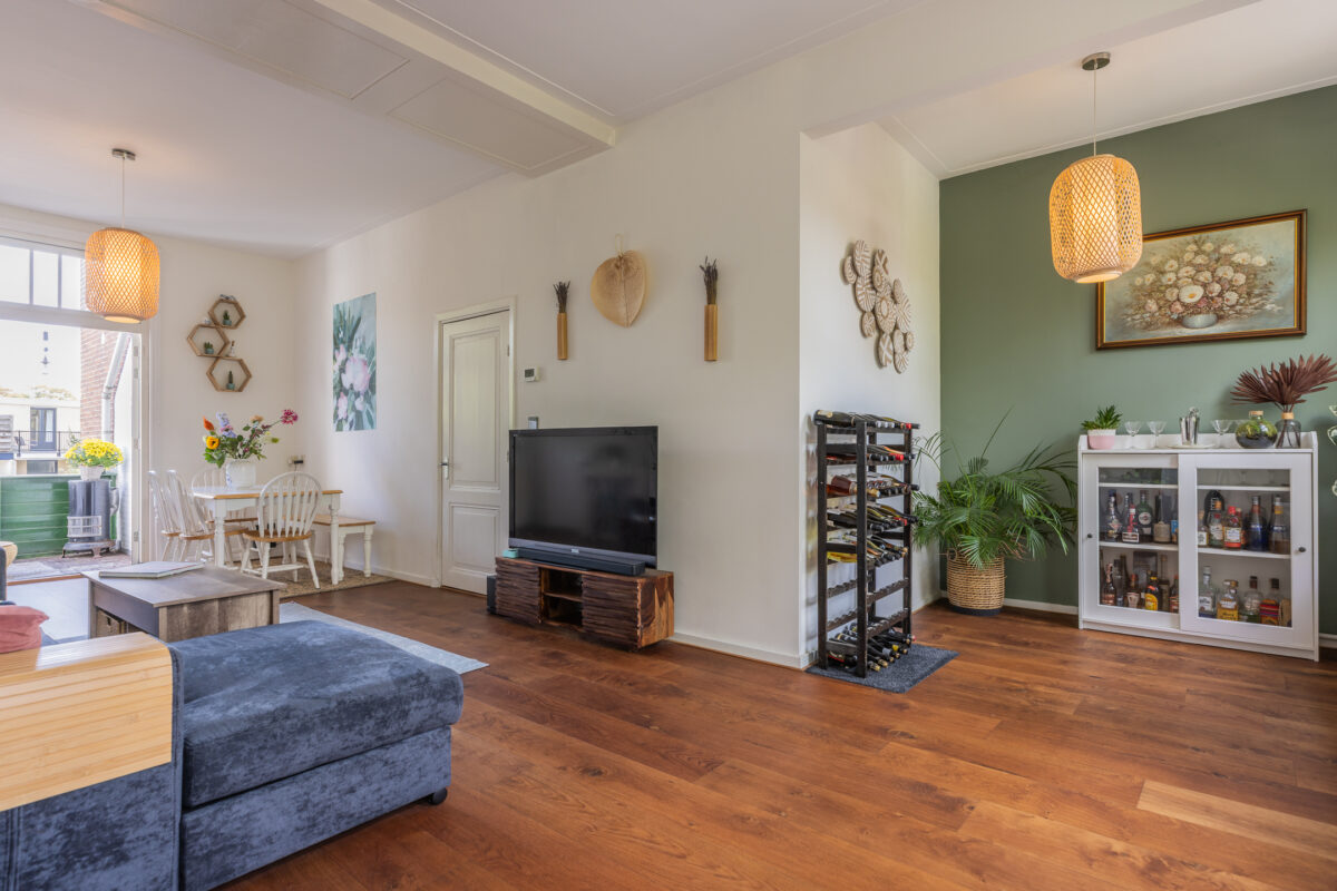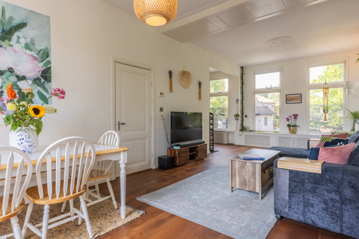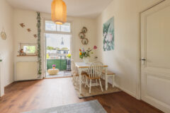 De L-vormige living voelt direct als een uitnodigende leefruimte. Grote raampartijen aan beide zijden zorgen voor veel daglicht en uitzicht op het groen in de straat. De houten vloer, rustige kleuren en sfeervolle details creëren een ontspannen en huiselijke sfeer. Aan de achterzijde bevindt zich het eetgedeelte met openslaande deuren naar het ruime balkon. Dankzij de ligging op het zuiden geniet je hier vrijwel de hele dag van de zon.