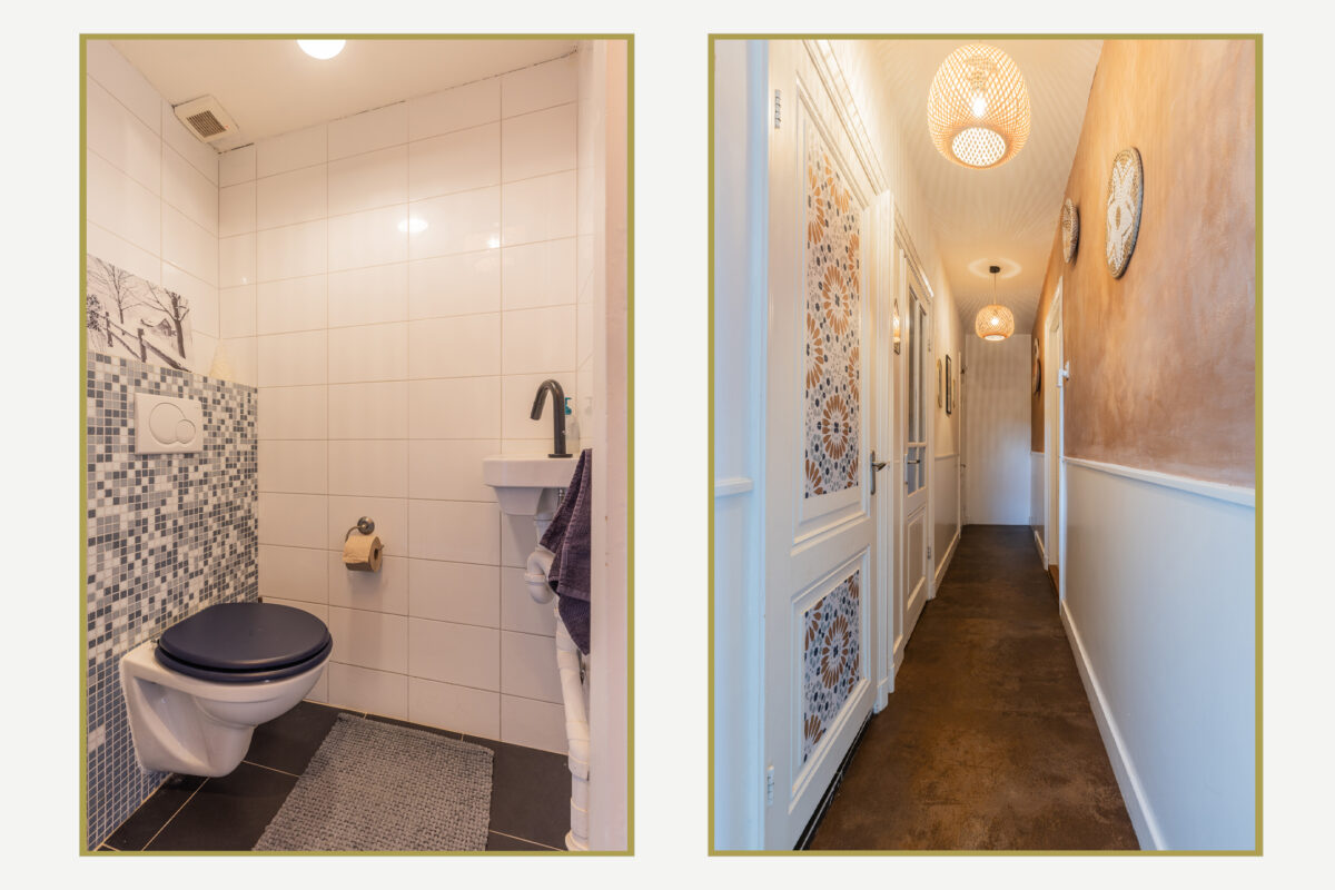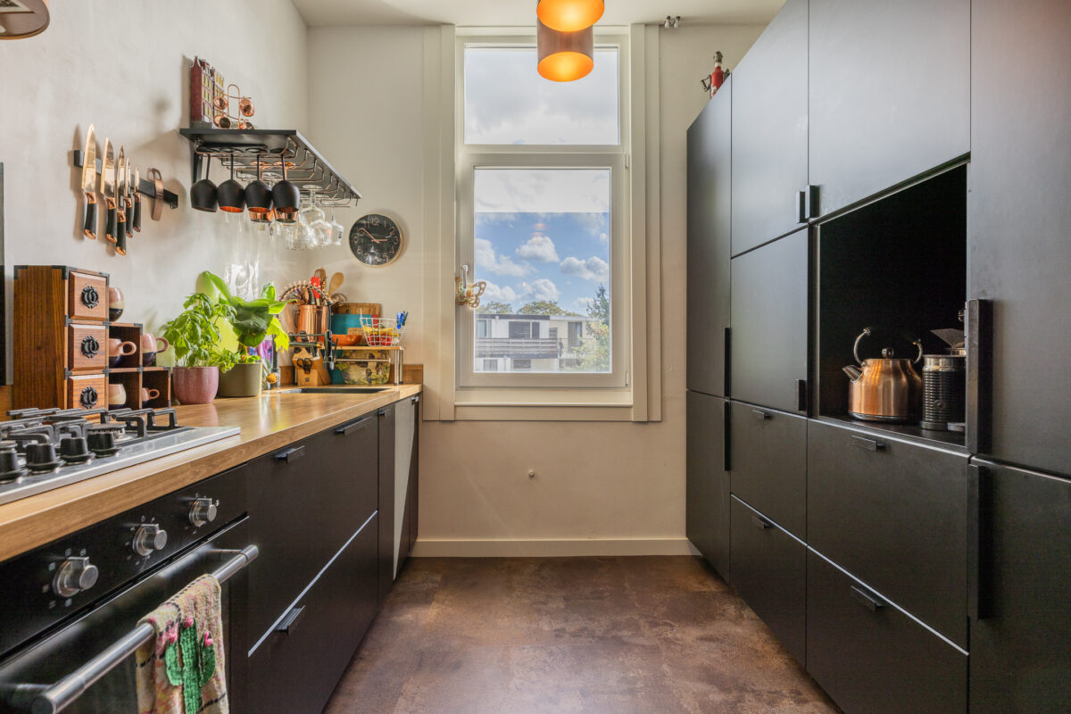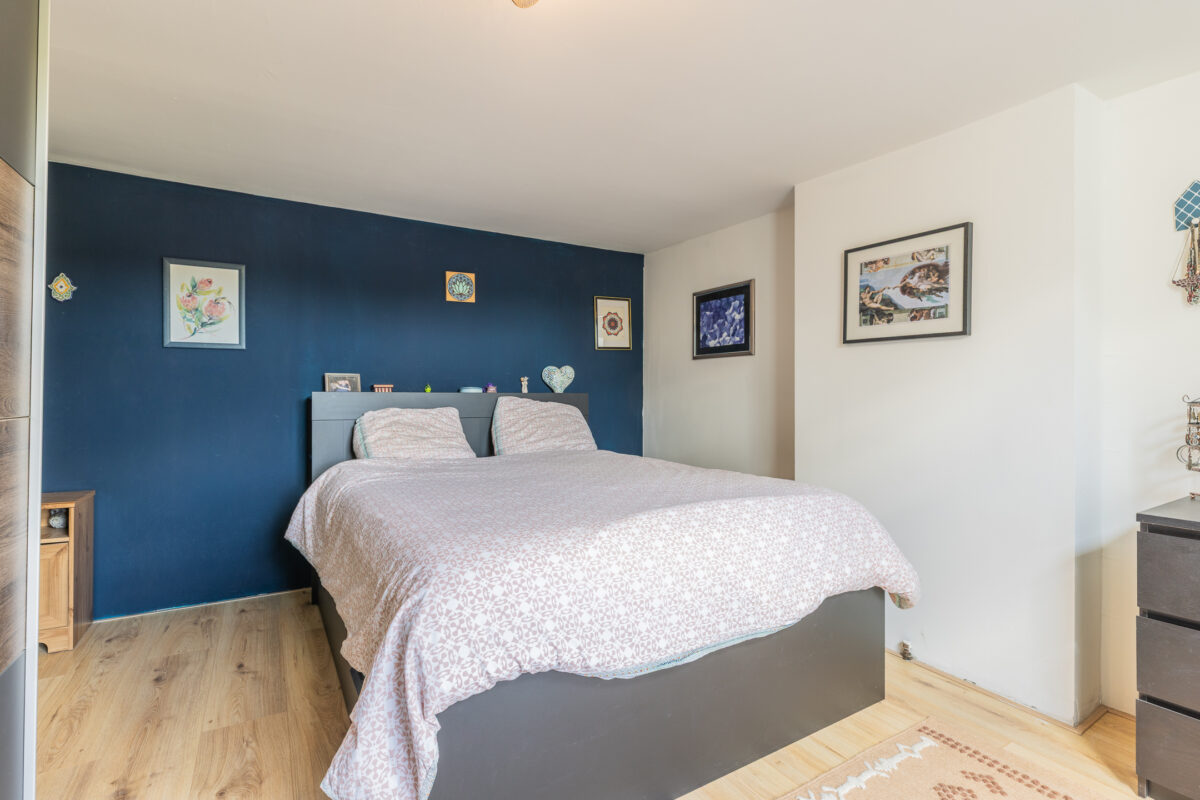 De keuken heeft een moderne en stoere uitstraling met zwarte fronten, een houten werkblad en stijlvolle details. De badkamer is recent vernieuwd en uitgevoerd in een luxe wellness-stijl met groene tegels, messing kranen, een vrijstaand ligbad met regendouche en een natuurlijke vloerafwerking. Daarnaast beschikt de woning over drie ruime slaapkamers, grotendeels kunststof kozijnen met dubbel glas, een praktische bergruimte met aansluiting voor wasmachine en droger en een verrassend ruime kelder. Door de hoekligging is er extra privacy en meer lichtinval dan in veel andere bovenwoningen.