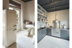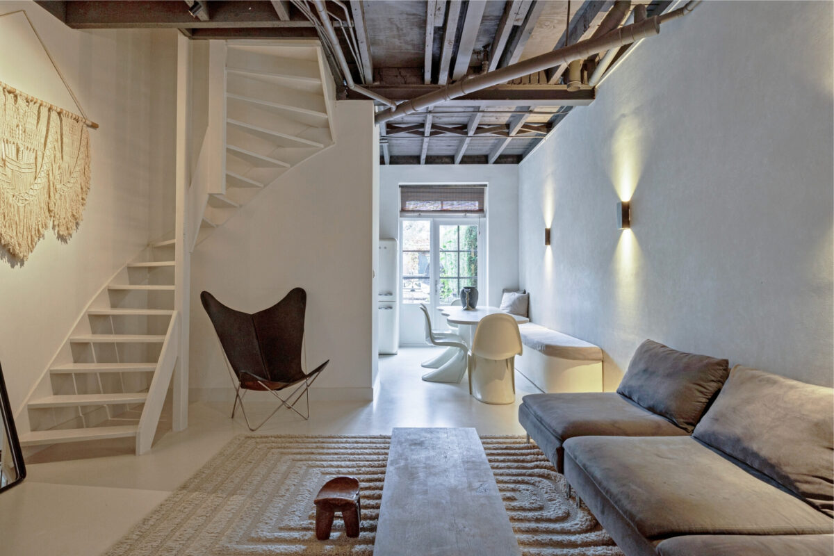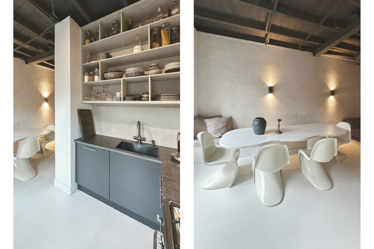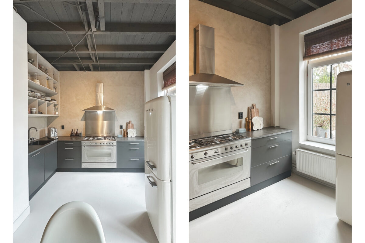 Entree met meterkast en toilet. Vanuit de hal stap je de ruime woonkamer binnen, met hoge plafonds, betonlook afwerking en zichtbare balken. Aan de voorkant bevindt zich het zitgedeelte, richting de achterzijde loopt de woonkamer door naar de woonkeuken. De woonkeuken ligt aan de tuinzijde en is een fijne leefruimte met plaats voor een grote eettafel. De keuken staat in een hoekopstelling en is uitgerust met een groot gasfornuis, open kastenwand en donkerkleurige fronten. Via een deur bereik je de diepe achtertuin.