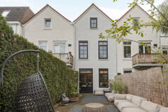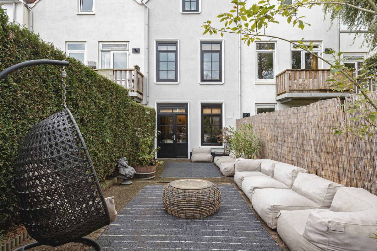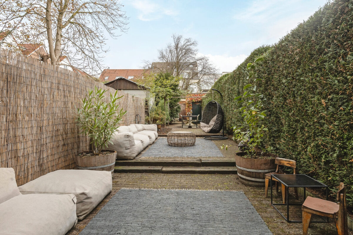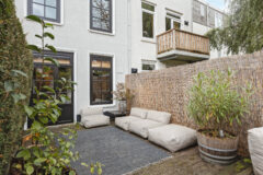 De achtertuin is groen en biedt veel privacy. Met meer dan twintig meter diepte is een tuin als deze voor een woning zo dicht bij het centrum echt een luxe. Gelegen op het noorden, met meerdere terrassen, biedt deze tuin door zijn diepte op elk moment van de dag een plekje in de zon. De tuin is te bereiken via de tuindeuren vanuit de woonkeuken en via een achterom. Achter in de tuin staat een berging, ideaal voor fietsen en opslag.