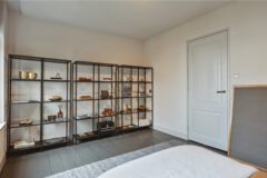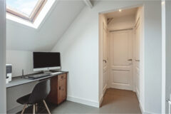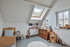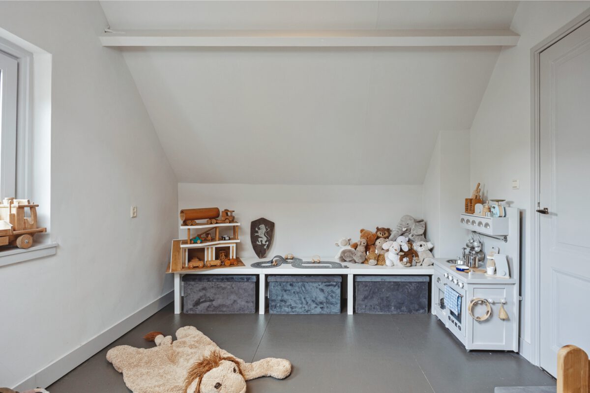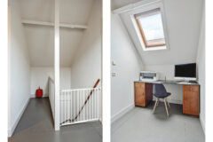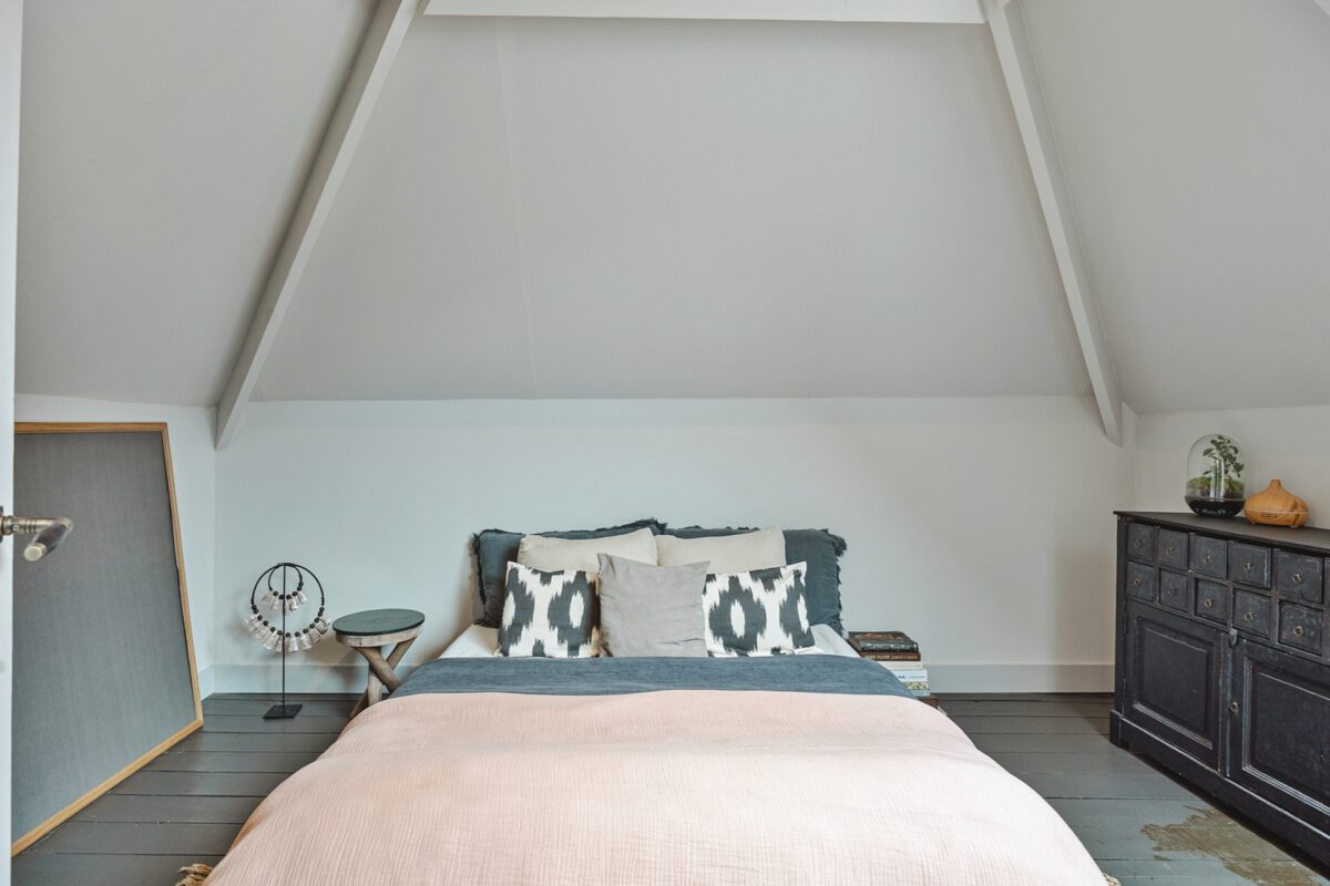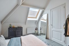 De vaste trap leidt naar de tweede verdieping. De ruimte op de overloop met dakraam is goed te gebruiken als werkplek. Ook zijn twee bergingen/knieschotten aanwezig. Aan de voor- en achterzijde bevinden zich weer twee ruime slaapkamers. De slaapkamer aan de voorzijde heeft een dakraam. De slaapkamer aan de achterzijde heeft een raam en een dakraam. Beide kamers hebben zicht op de balkconstructie. Een ideale verdieping voor slapen, logeren of een werkplek aan huis.