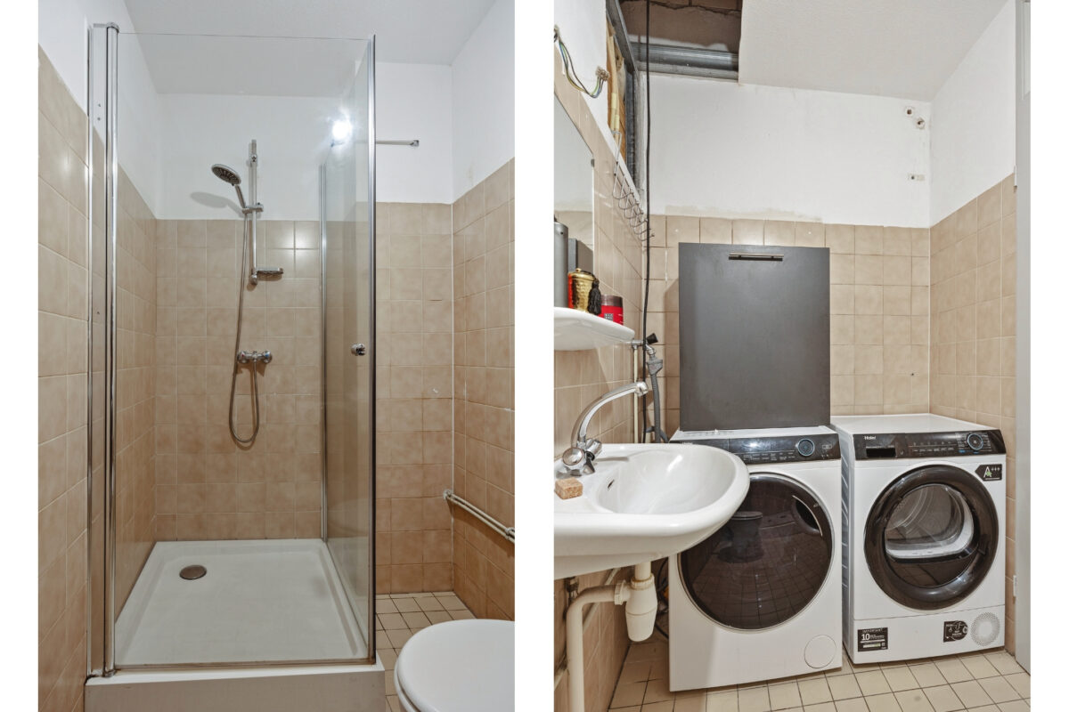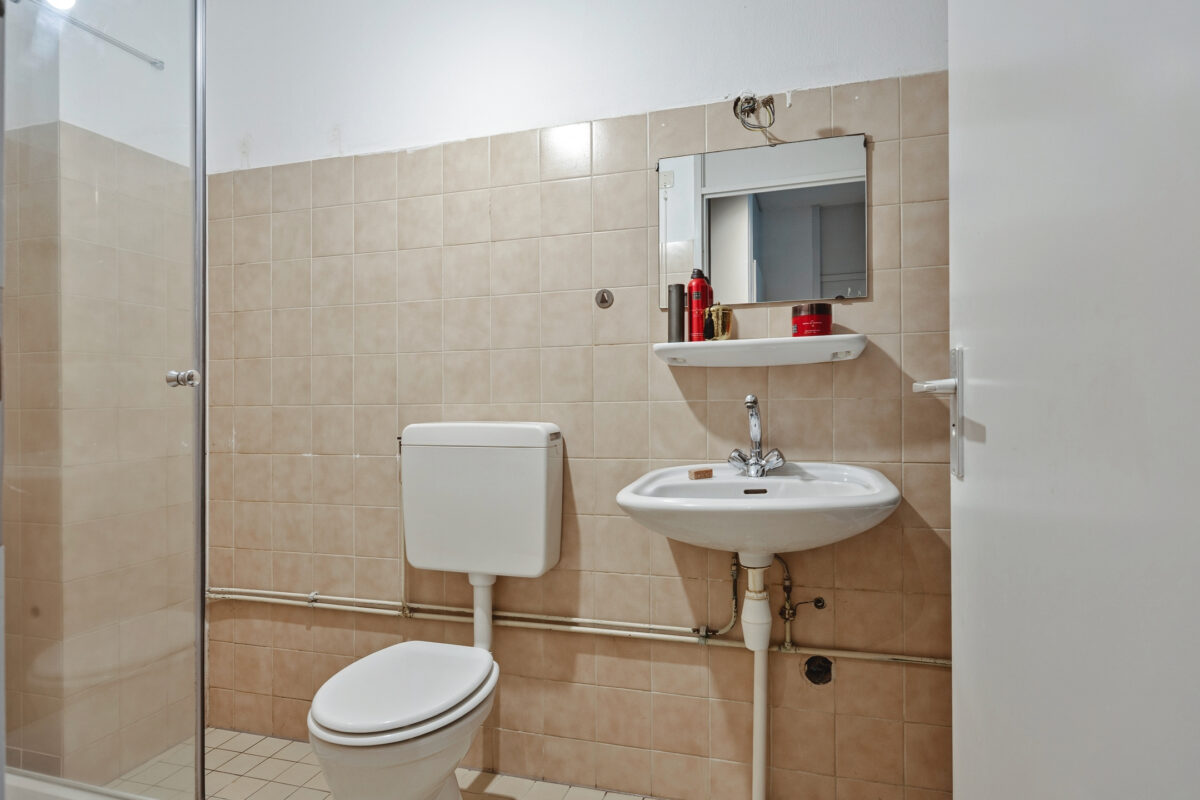 Vanaf de overloop toegang tot twee ruime slaapkamers. Zowel de slaapkamer aan de voorzijde als aan de achterzijde beslaat de volledige breedte van de woning en heeft twee grote ramen. De badkamer is functioneel en voorzien van een douche, wastafel, toilet en aansluitingen voor wasmachine en droger.