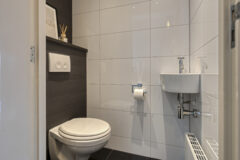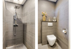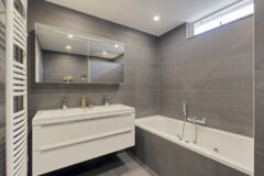 Overloop met twee slaapkamers en een luxe badkamer. De slaapkamer aan de achterzijde is ruim en licht dankzij de brede raampartij en beschikt over een grote inbouwkast met schuifdeuren. De slaapkamer aan de voorzijde is netjes afgewerkt en heeft eveneens veel lichtinval. De moderne badkamer is uitgevoerd in een stijlvolle grijs-antraciet kleurstelling en voorzien van een whirlpool, royale inloopdouche met regendouche, dubbel wastafelmeubel met spiegelkast, tweede toilet, vloerverwarming en inbouwspots.