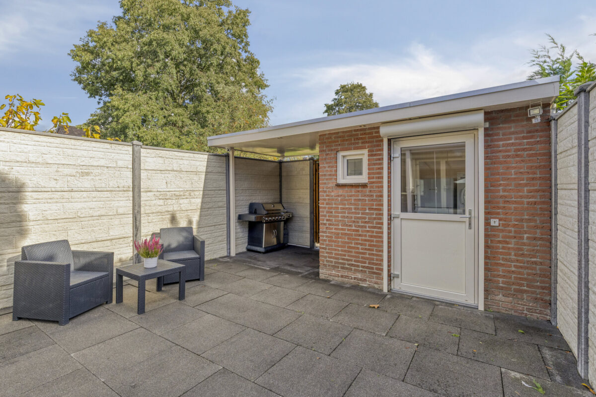 Onderhoudsarme tuin met volledig afsluitbare serre (2019). Dankzij de glazen schuifwanden is dit een comfortabele vierseizoenenkamer – ideaal om te loungen, buiten te eten of als speelruimte. De serre is voorzien van inbouwspots en verwarming, waardoor je er het hele jaar gebruik van kunt maken. Achterin de tuin staat een vrijstaande stenen berging/bijkeuken met water, elektra en ruimte voor wasmachine, droger en extra vriezer. De buitenzijde is eveneens voorzien van inbouwspots. Achterom aanwezig. De oprit biedt royaal plaats aan drie auto’s en is volledig afsluitbaar met een elektrische sierpoort. De garage is voorzien van een elektrische sectionaaldeur.