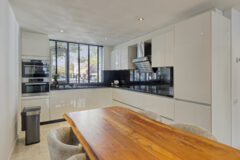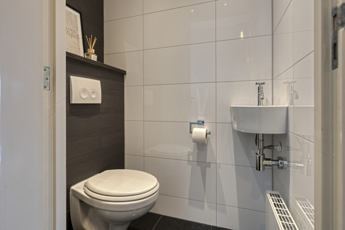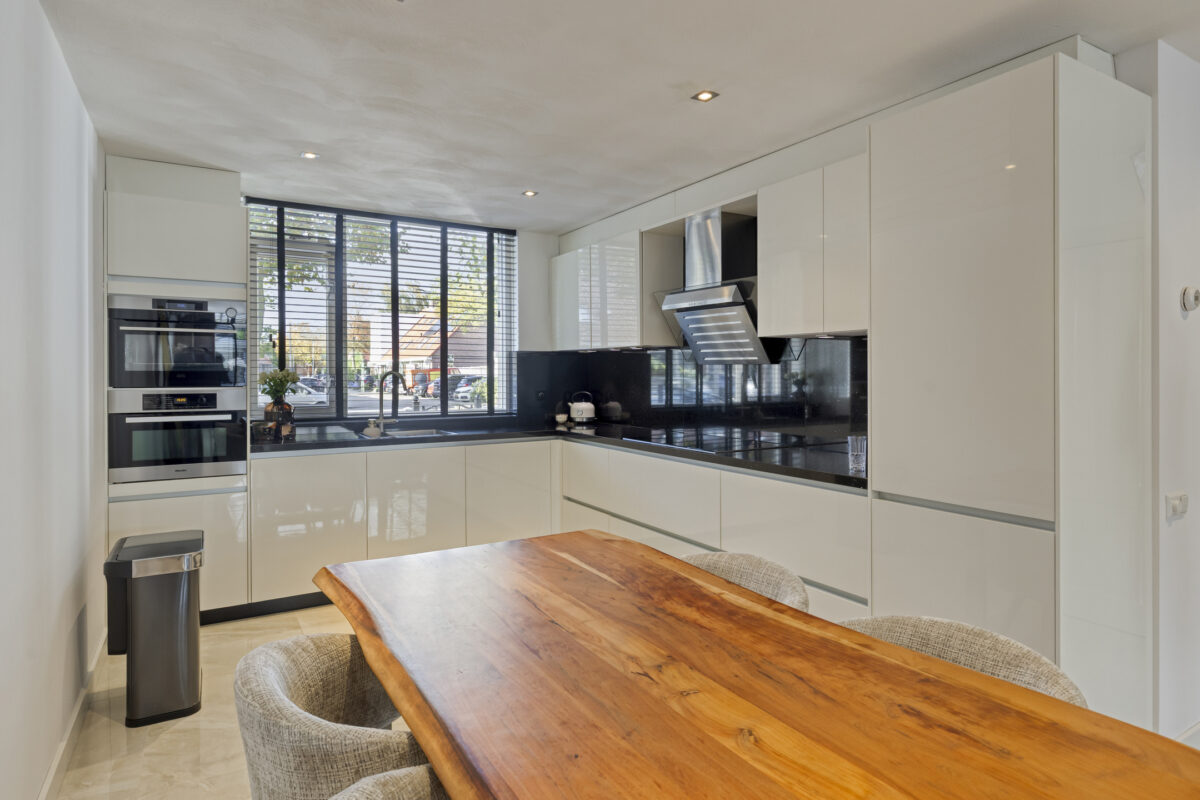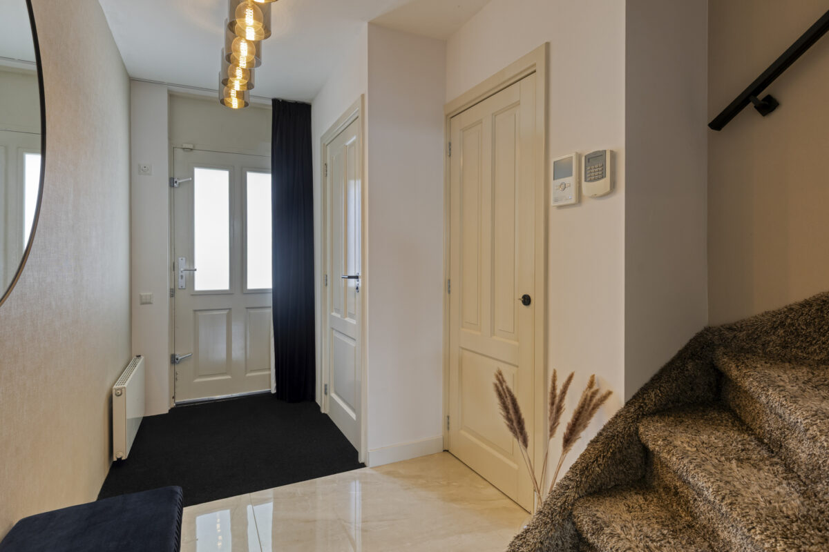 Entree met toilet en trapopgang. Via de glaspaneeldeur kom je in de royale woonkamer met marmerlook tegelvloer, vloerverwarming, inbouwspots en airco. De uitbouw maakt de woonkamer extra ruim en licht, met openslaande deuren naar de serre die de tuin bij het woongedeelte betrekt. Aan de voorzijde ligt de moderne keuken met hoogglans fronten en een natuurstenen blad, uitgerust met een inbouwkoelkast, stoomoven, combioven, vaatwasser, grote inductiekookplaat en afzuigkap.