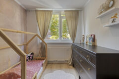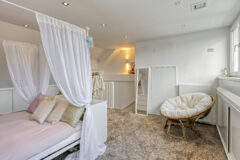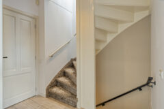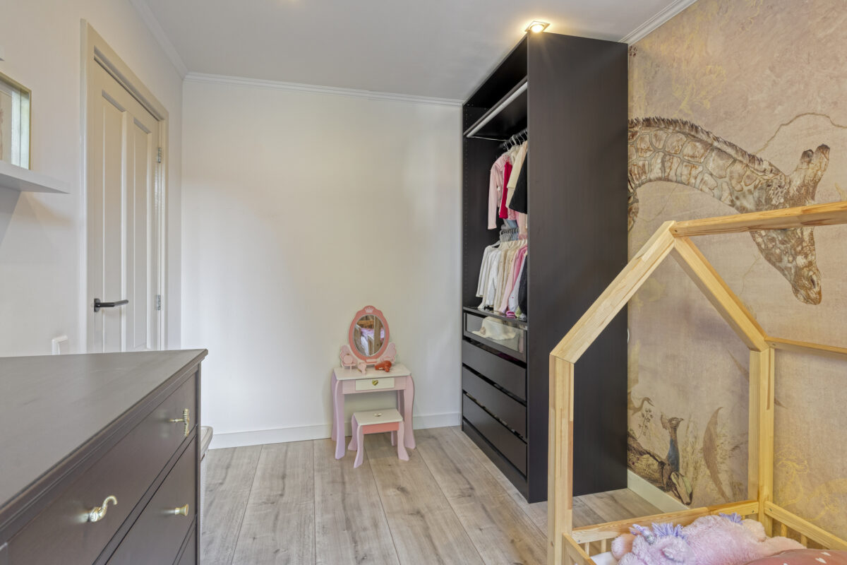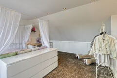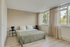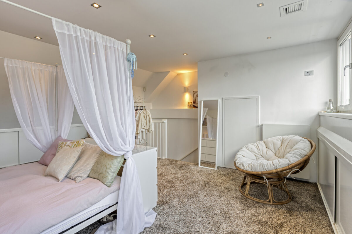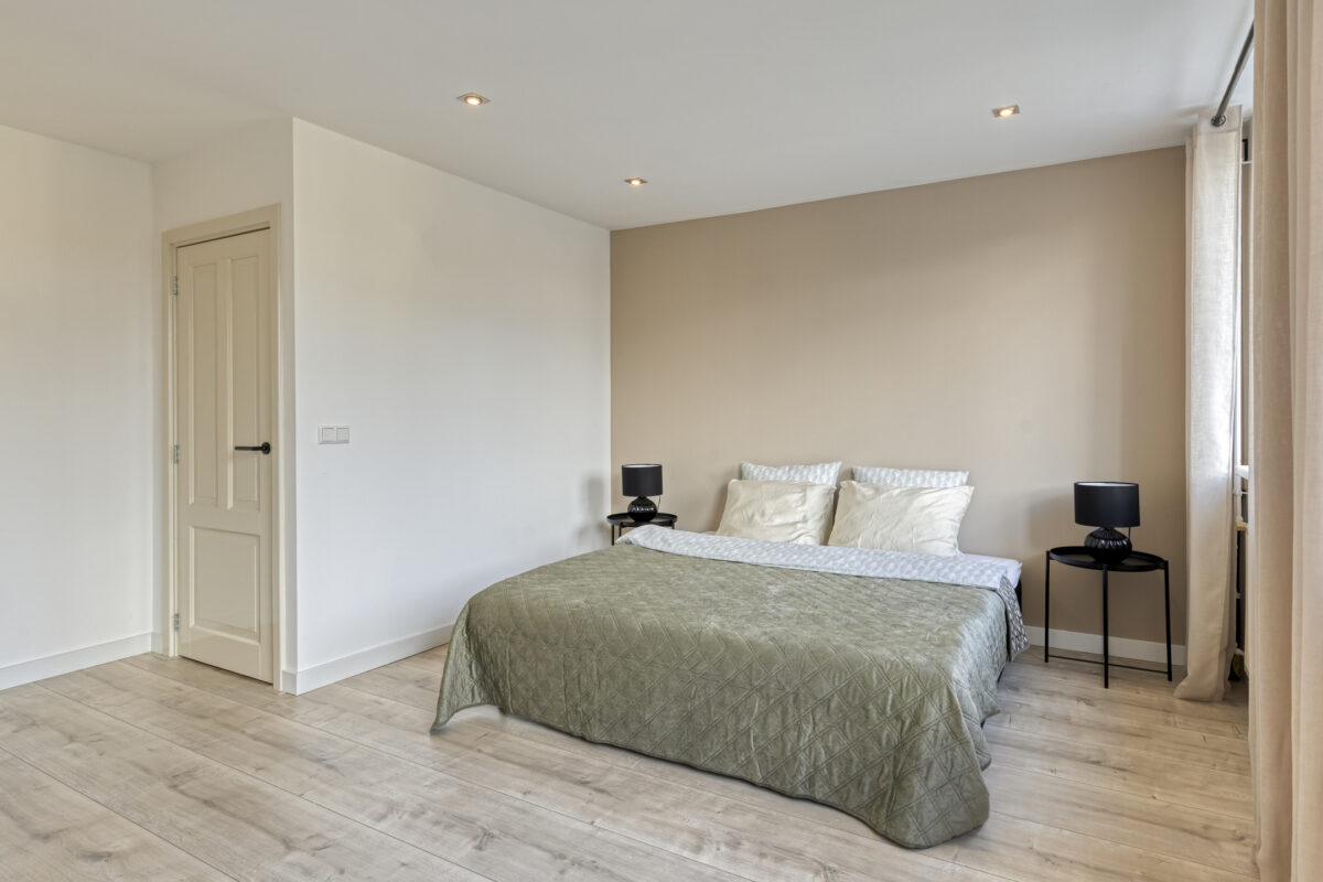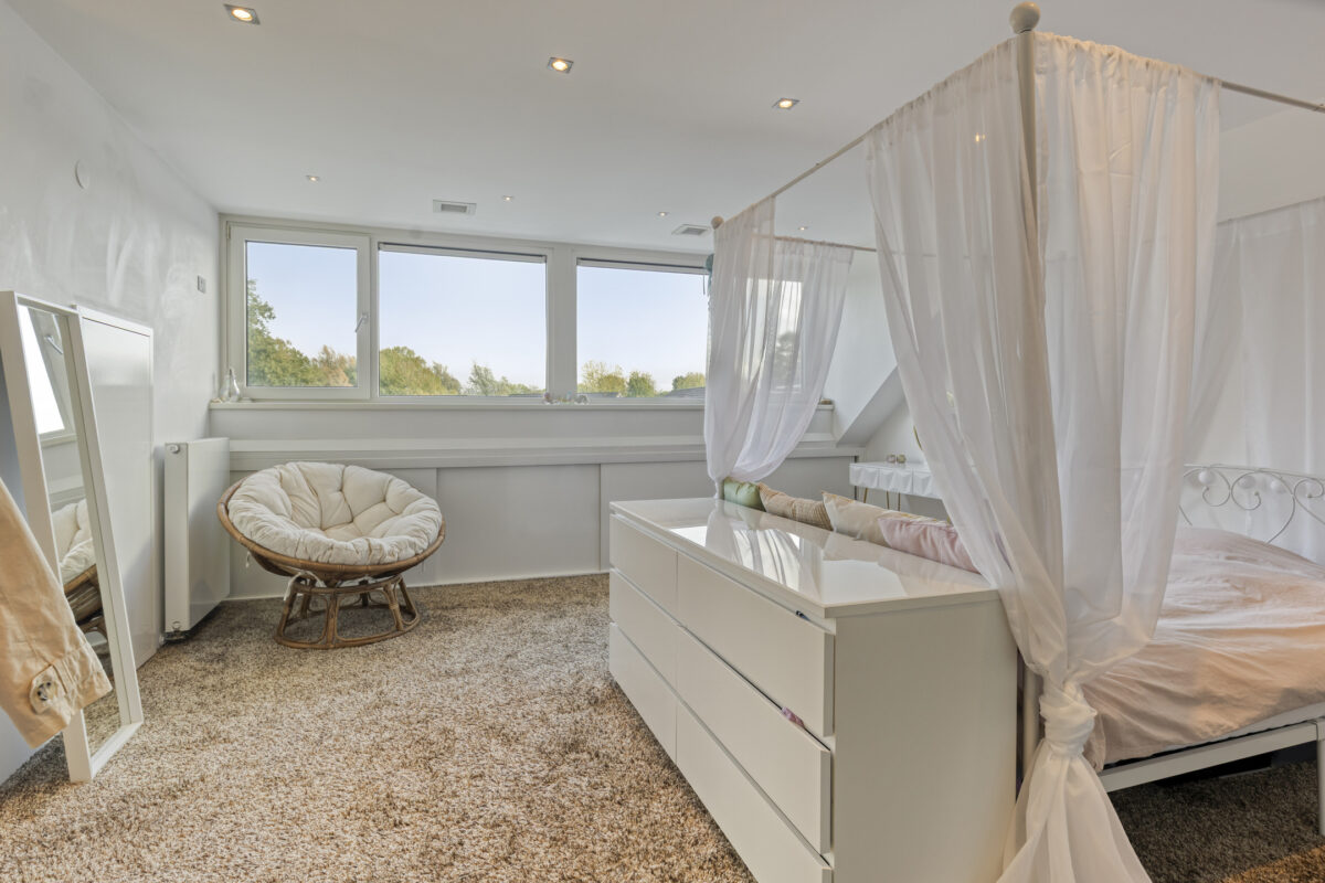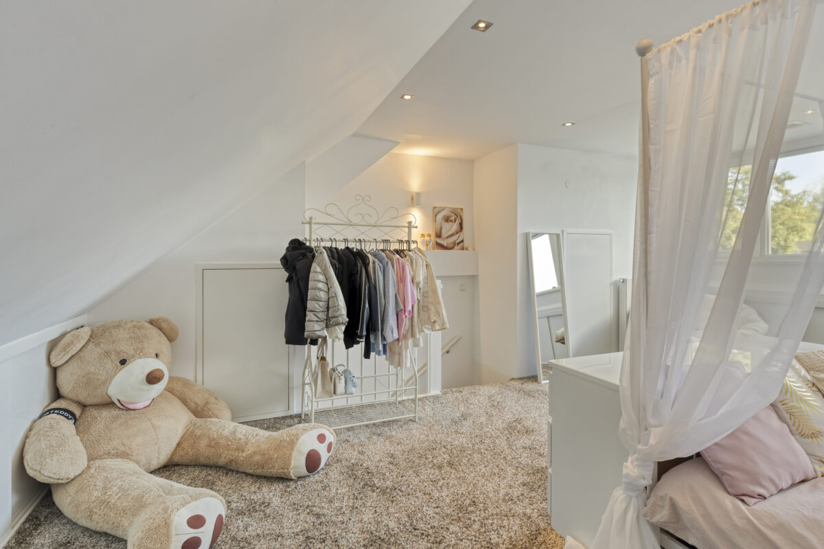 Vaste trap naar een royale master bedroom met brede dakkapel, veel lichtinval, airconditioning en inbouwspots. Achter de schuifdeuren bevindt zich praktische bergruimte. De kamer is ruim genoeg om desgewenst te gebruiken als werkruimte of studio.